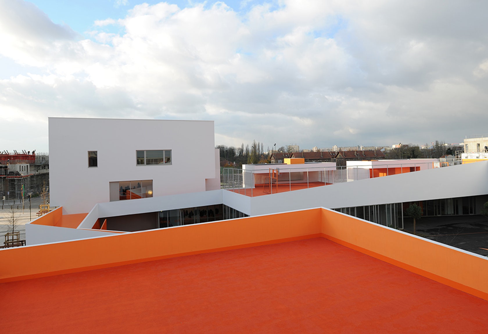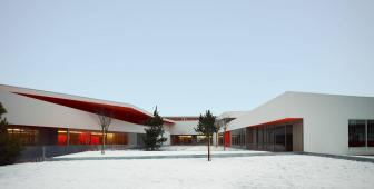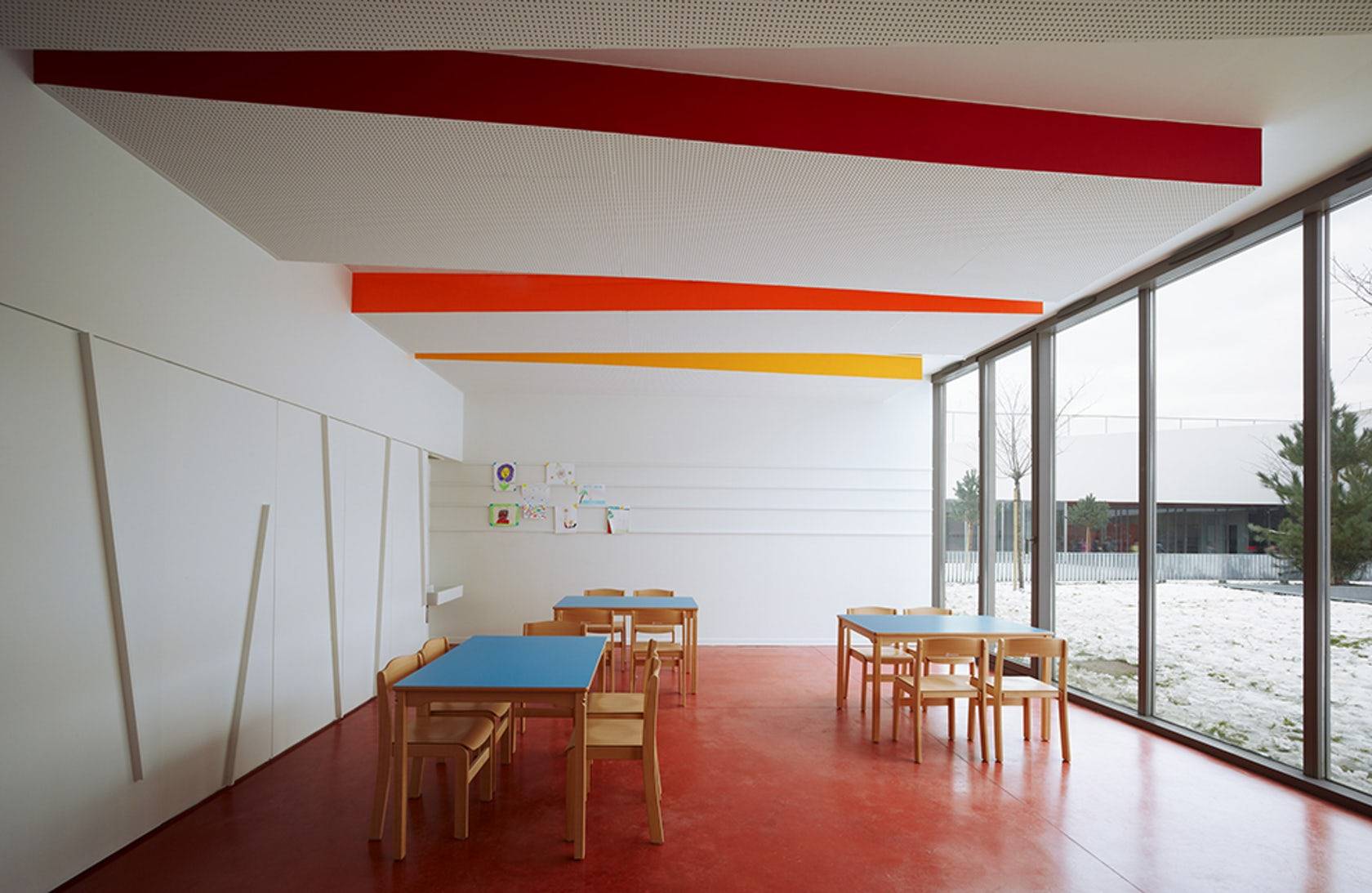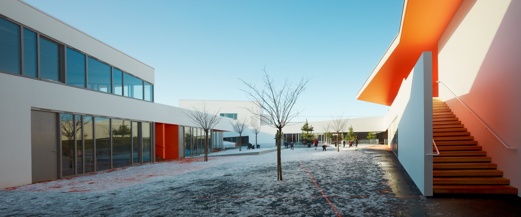 這片學(xué)校建筑群坐落在一處不規(guī)則四邊形形狀的場地上,是在一座被拆除的建筑的舊址上重新搭建的。設(shè)計標(biāo)書要求盡可能地避免建造封閉式的矩形體量,即使矩形正是這個地塊的特色。此外,考慮到建筑密度和建筑高度方面的限制,Dominique COULON & Associates事務(wù)所的建筑師對于標(biāo)書中分別建造小學(xué)和幼兒園的要求產(chǎn)生了質(zhì)疑。