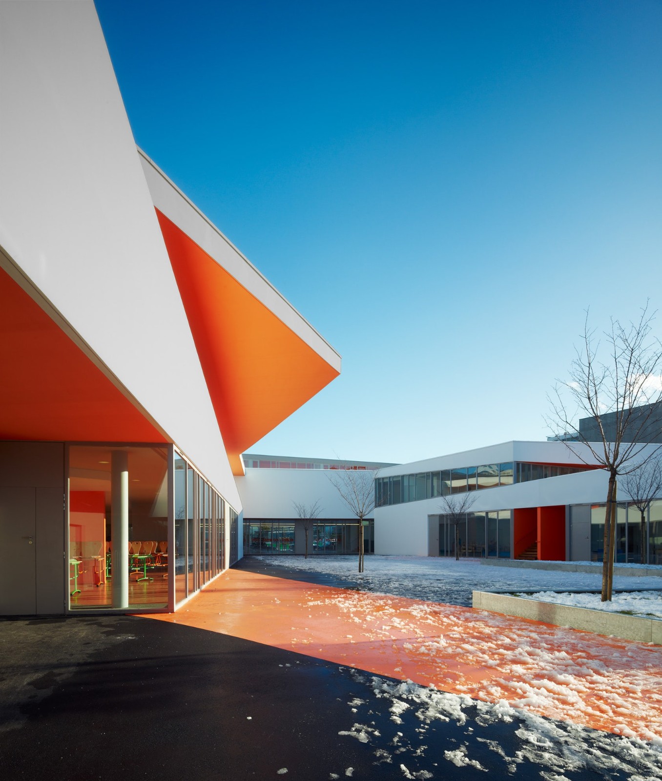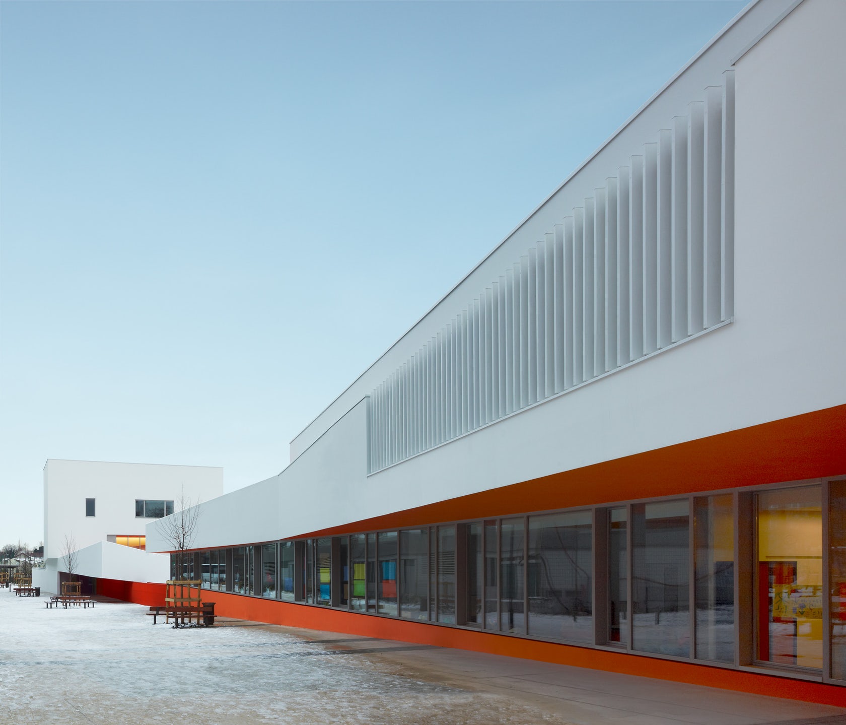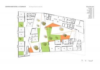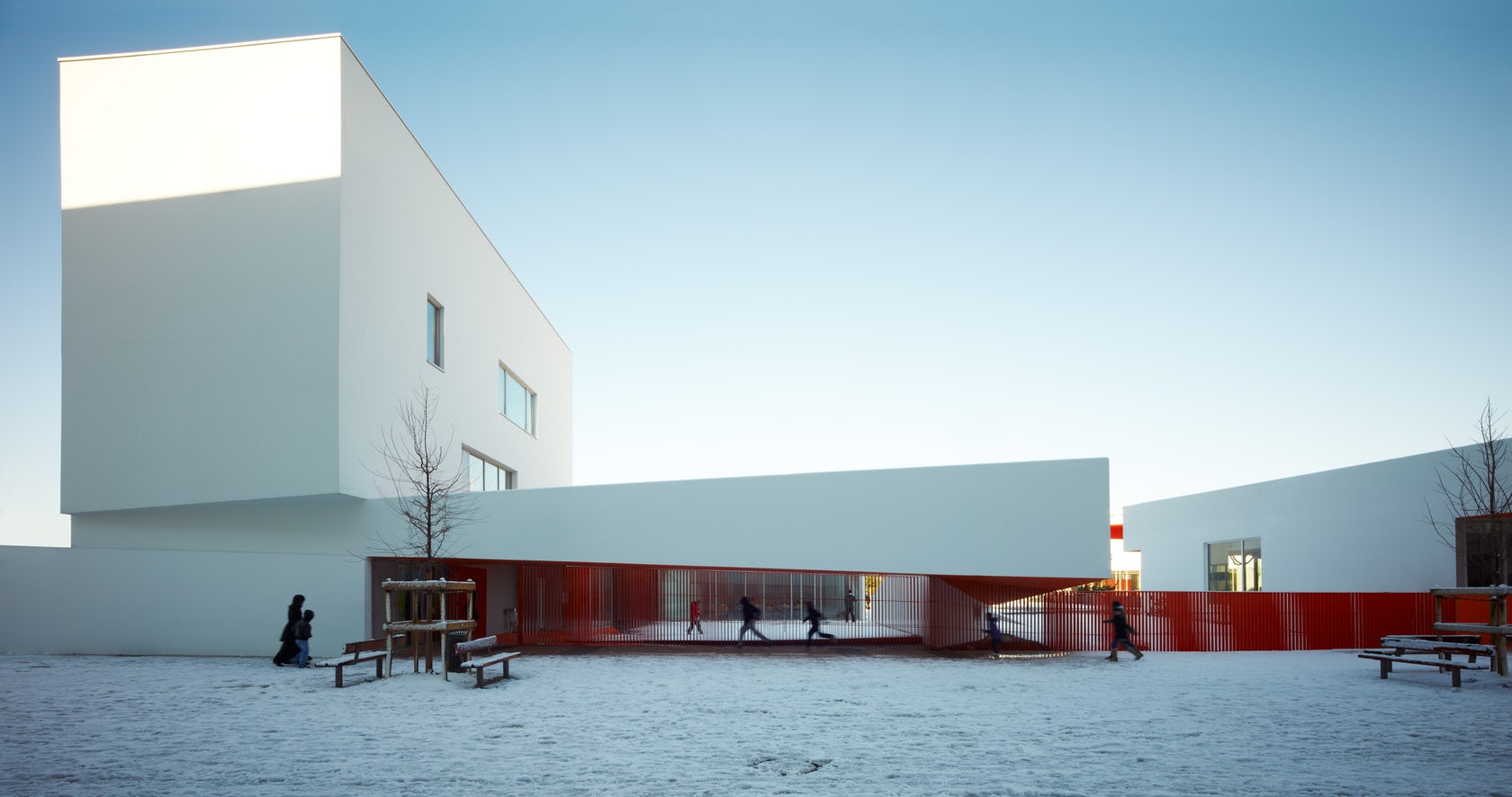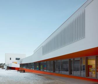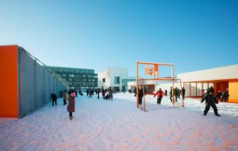 建筑師在設(shè)計構(gòu)想中描繪了一幅統(tǒng)一的組織規(guī)劃提案,以其藝術(shù)大師般的手法在場地兩端之間的三維空間內(nèi)進行設(shè)計,并通過一系列坡道使兩端的空間相連接。因此,幼兒園的教室被推到了場地的東側(cè),位于入口上方樓層的懸挑部分中,而小學(xué)的教室則占據(jù)了西邊的場地,同時俯瞰著幼兒園與小學(xué)之間的花園。大童操場與包含了共享餐廳的幼童操場合并,而孩子們的運動場空間則位于另一棟包含共享圖書館的建筑的屋頂。