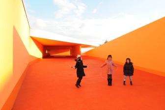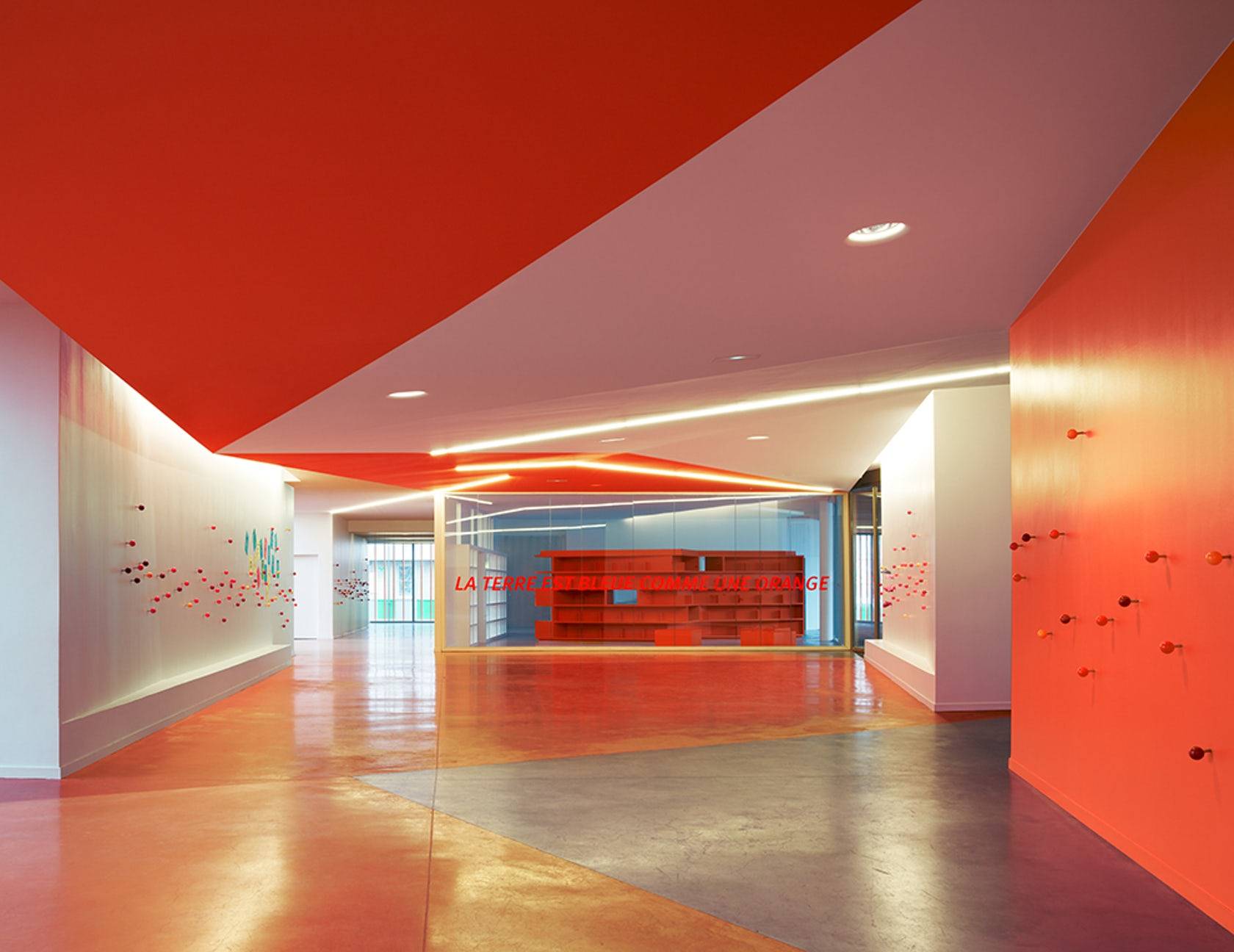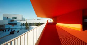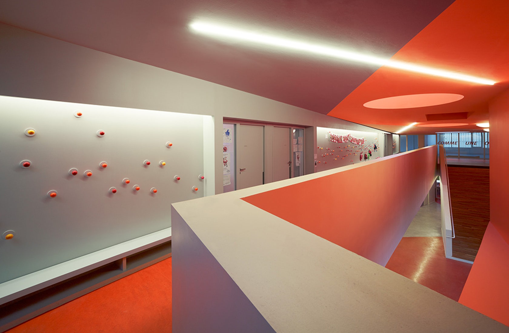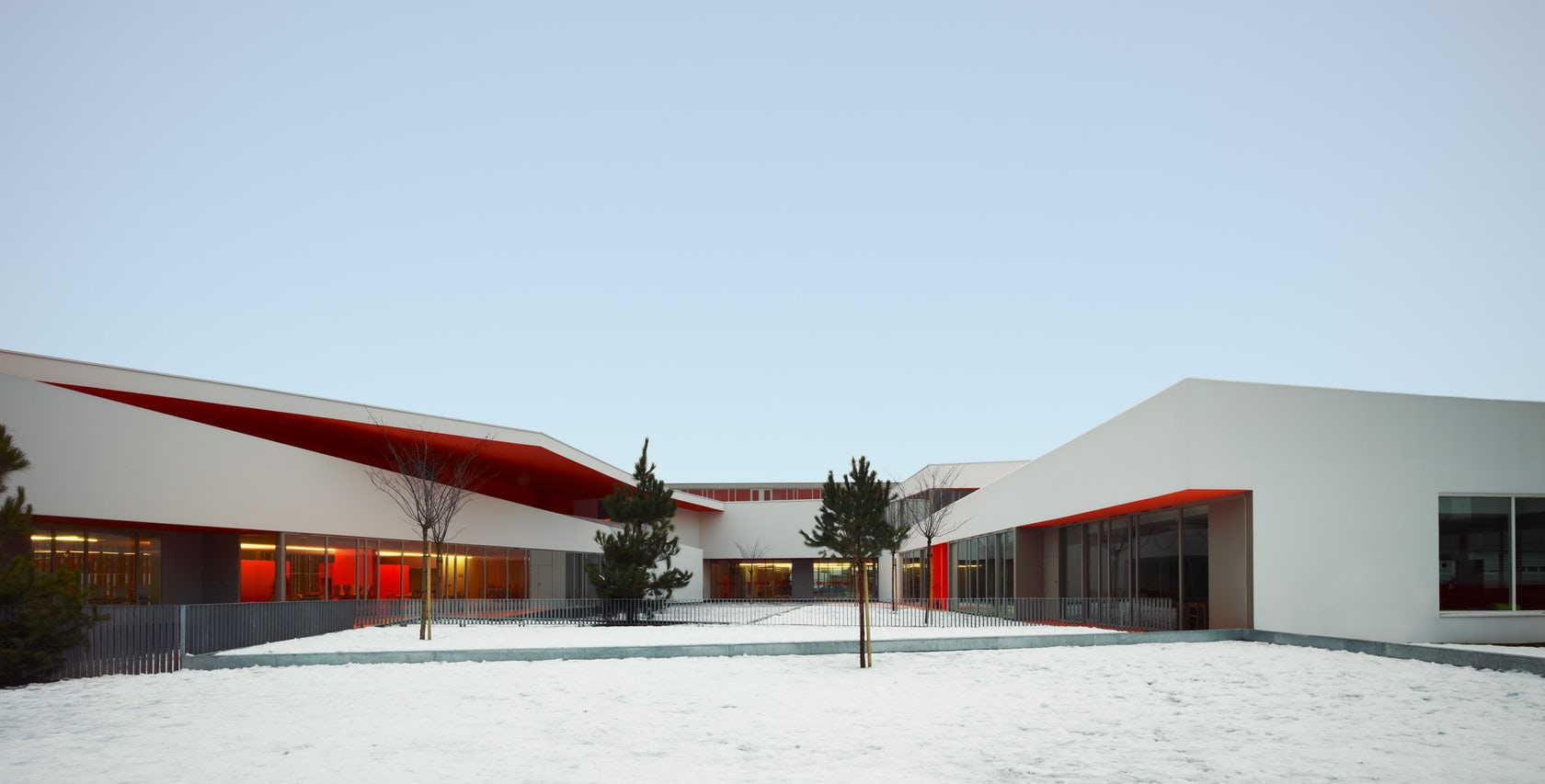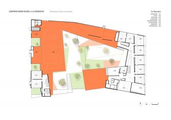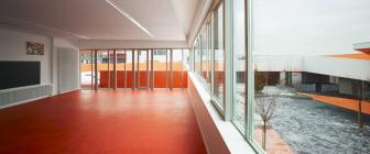 建筑師在設(shè)計構(gòu)想中描繪了一幅統(tǒng)一的組織規(guī)劃提案,以其藝術(shù)大師般的手法在場地兩端之間的三維空間內(nèi)進行設(shè)計,并通過一系列坡道使兩端的空間相連接。因此,幼兒園的教室被推到了場地的東側(cè),位于入口上方樓層的懸挑部分中,而小學(xué)的教室則占據(jù)了西邊的場地,同時俯瞰著幼兒園與小學(xué)之間的花園。大童操場與包含了共享餐廳的幼童操場合并,而孩子們的運動場空間則位于另一棟包含共享圖書館的建筑的屋頂。