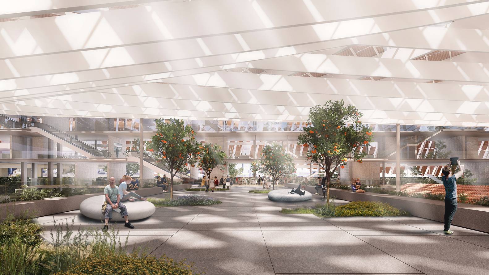 盡管這是一種創(chuàng)新設(shè)計(jì),但整體既指地方建筑,也指其形式,指的是現(xiàn)有大型開(kāi)放式結(jié)構(gòu)的輕盈性,因此大型薄型構(gòu)件像懸浮的織物一樣互相交錯(cuò)。