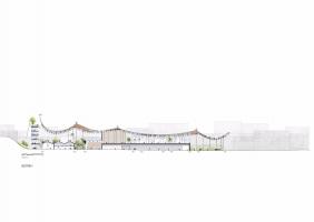 在北面,通過(guò)在它頂部架設(shè)一座橋,設(shè)計(jì)形成了一座升起的廣場(chǎng),它能作為整個(gè)項(xiàng)目和城市的公共花園和麗城。而在南部的街道和當(dāng)?shù)氐慕謪^(qū)層面,另外兩個(gè)廣場(chǎng)將產(chǎn)生另一個(gè)入口,可用于任何社交活動(dòng)和互動(dòng)。
