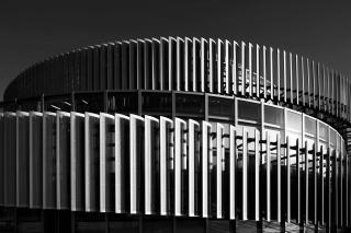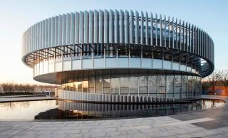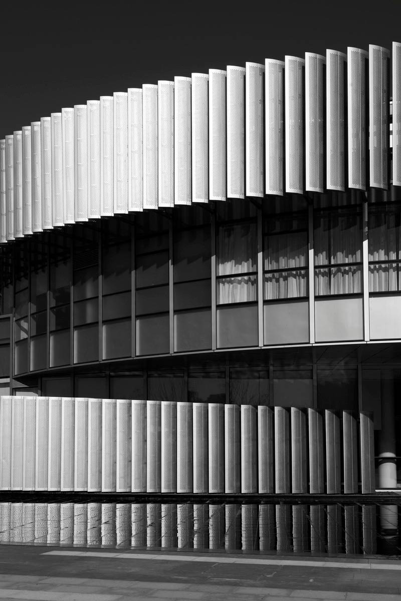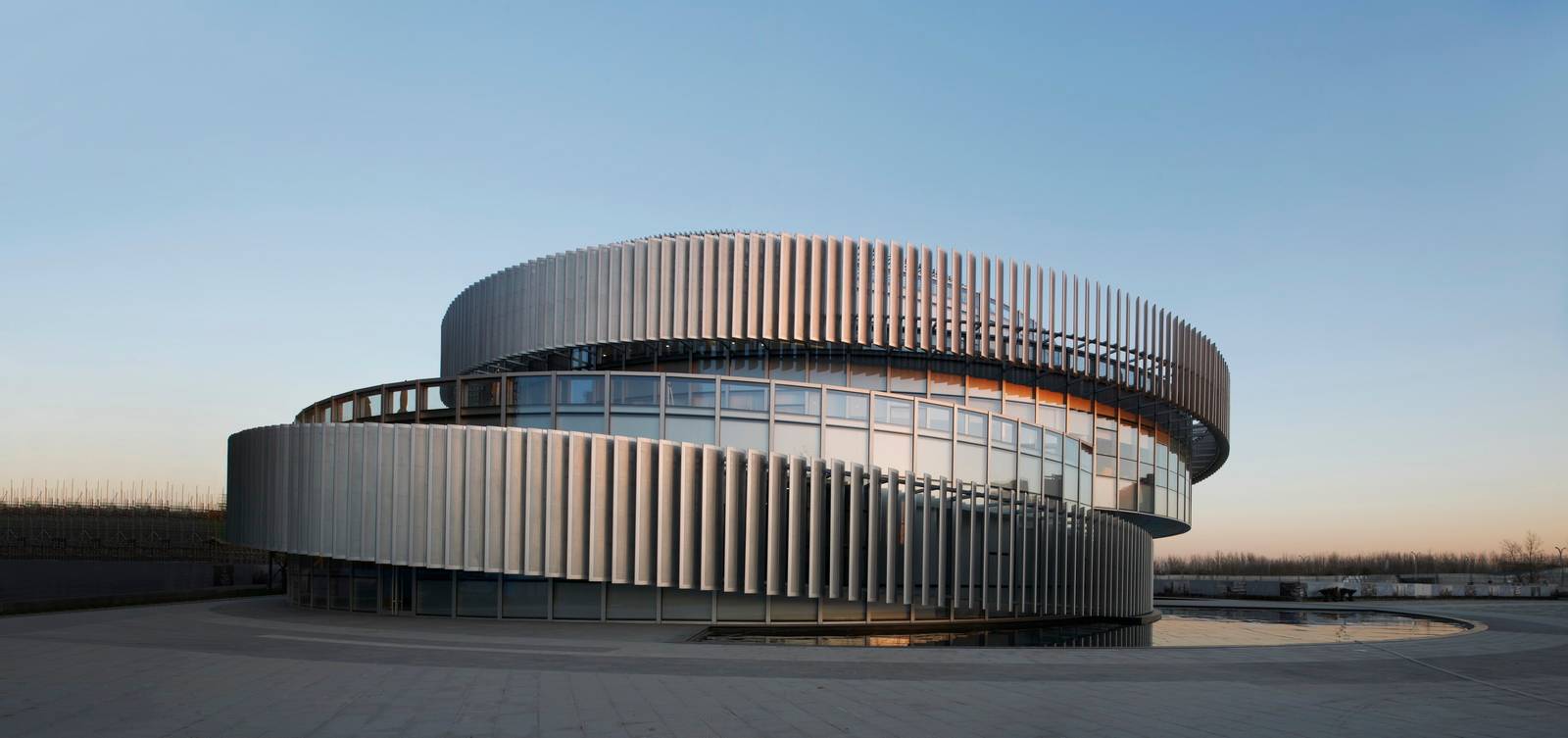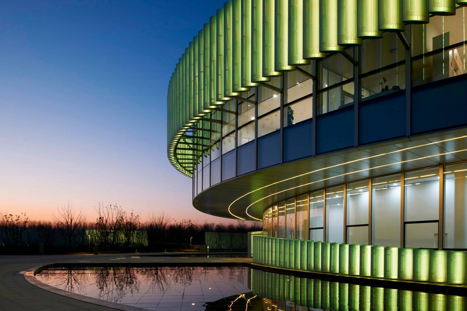 在大面積玻璃幕墻襯托下,金屬鋁板制成的百葉型材,使得展示中心更具科技感。每個百葉截面設(shè)計為梭型,運用穿孔鋁板的材質(zhì),使得建筑整體更加輕盈,隨著陽光的角度而產(chǎn)生不同的光影效果。每片梭形百葉都向螺旋的方向旋轉(zhuǎn)了30°,巧妙地隱藏了端頭的燈槽,弧形的受光面使燈光產(chǎn)生了一種韻律美,加強了建筑的整體流動感。