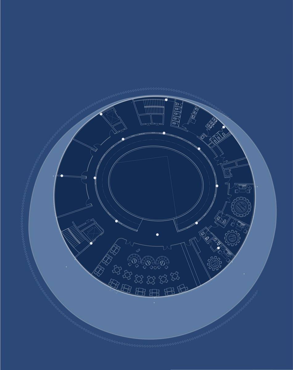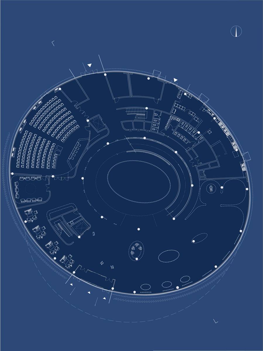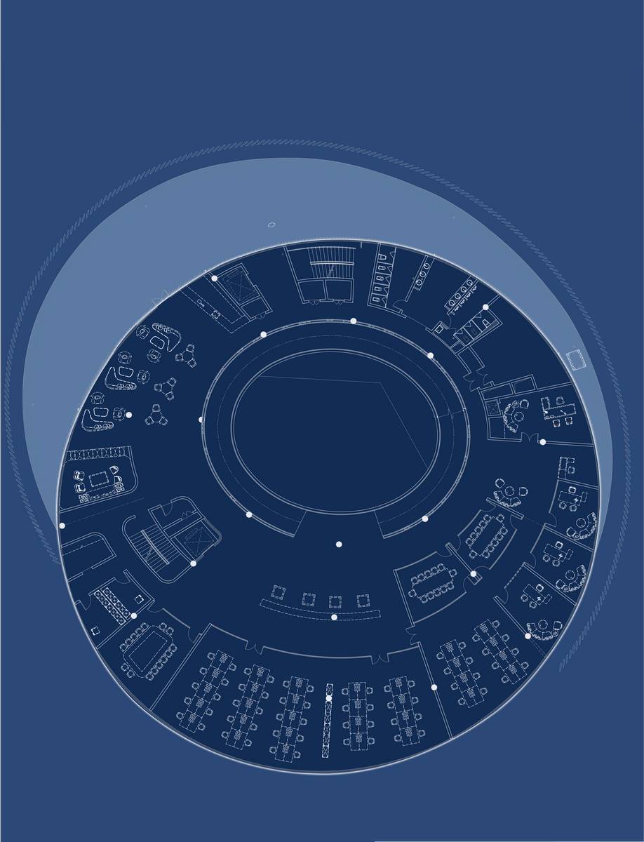 展示中心的空間核心引用雙螺旋結(jié)構(gòu),衍生出與中央景觀相結(jié)合的垂直空間。外部通過金屬百葉從地面水景盤旋而起直至屋頂平臺,內(nèi)部通過螺旋坡道有機地串聯(lián)整個建筑,形成生命步道,為各樓層之間建立起連貫而方便的內(nèi)部流線。三個不同功能的橢圓向著不同方向旋轉(zhuǎn),形成了多樣的趣味空間。室內(nèi)外的連續(xù)曲線同時組成雙螺旋結(jié)構(gòu),滿足了各個方向的視覺需求。螺旋百葉凝聚成為一個有機的結(jié)構(gòu),束縛住三個橢圓,行成了無窮連續(xù)的可塑形式。