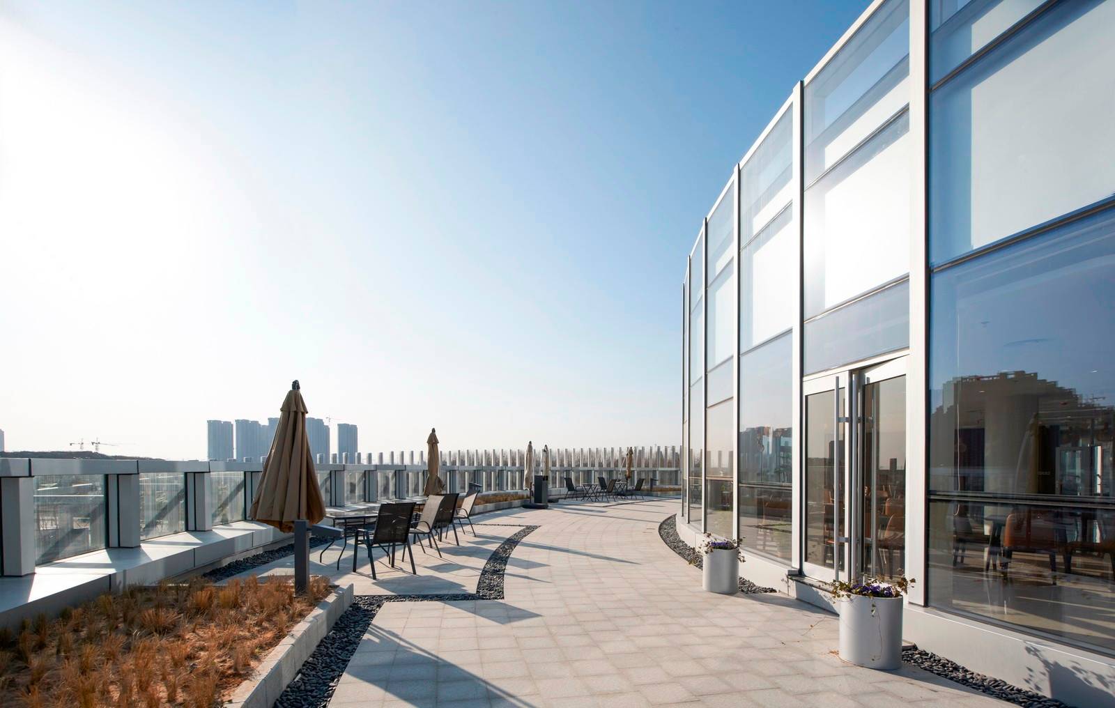 建筑首層為展示空間,大面積的落地玻璃幕墻更好地連接了室內(nèi)外視野。二層是靈活多變的辦公空間滿足了不同人群的需求;透過玻璃隔斷形成與中央空間的視覺延續(xù)。三層餐飲空間是整個建筑的最高點,戶外的觀景臺也提供了一個可欣賞整個園區(qū)的視角。