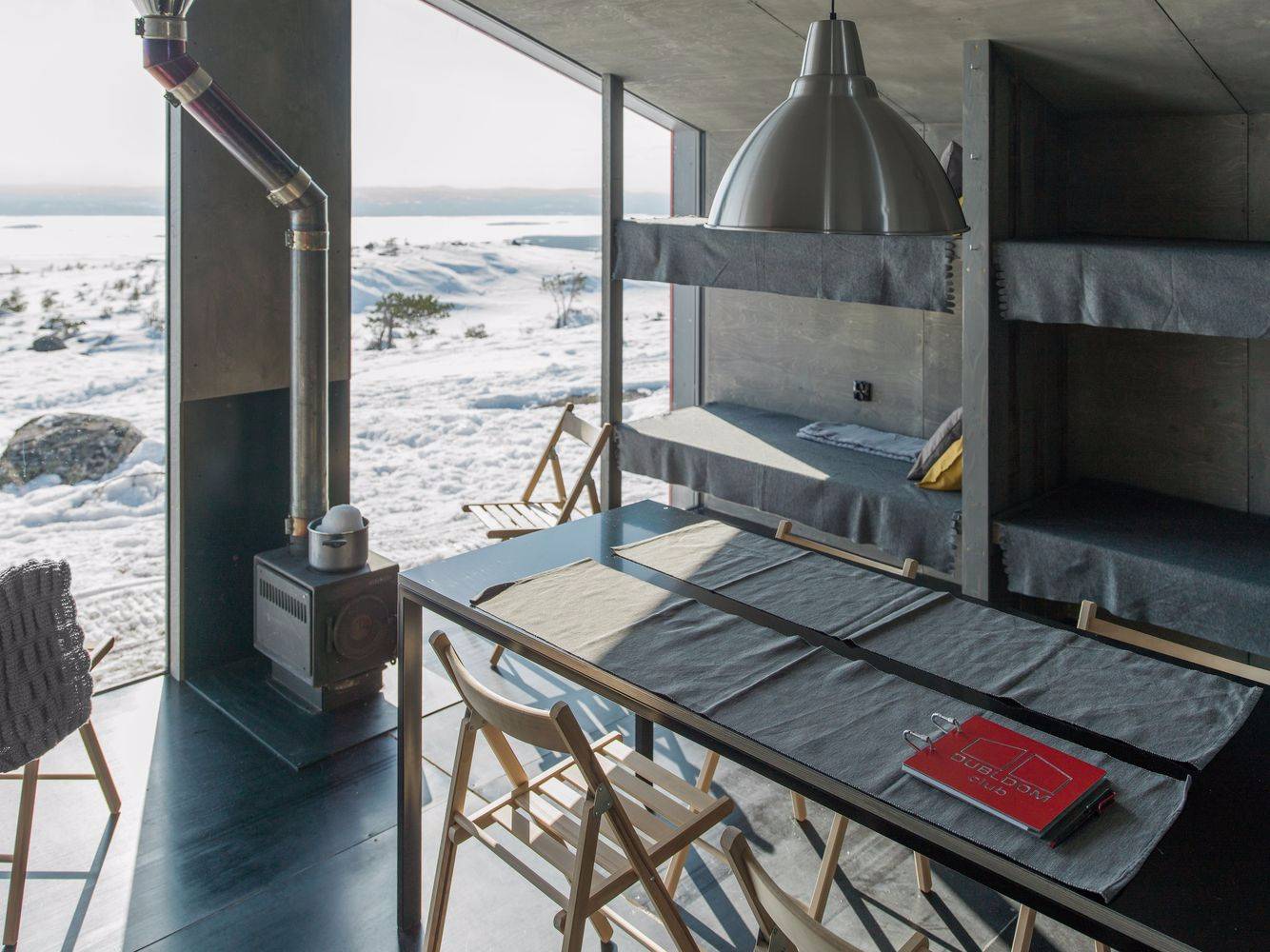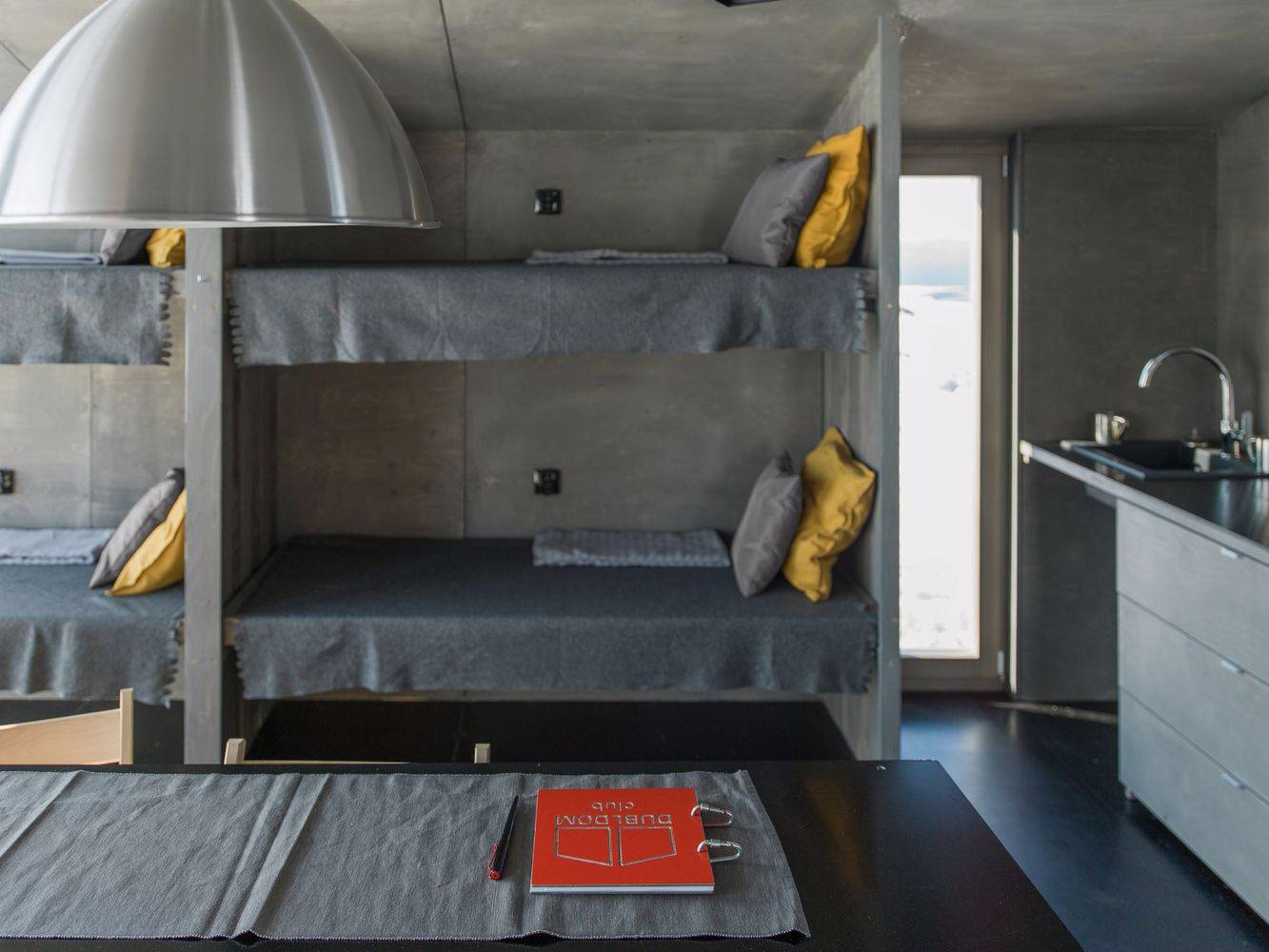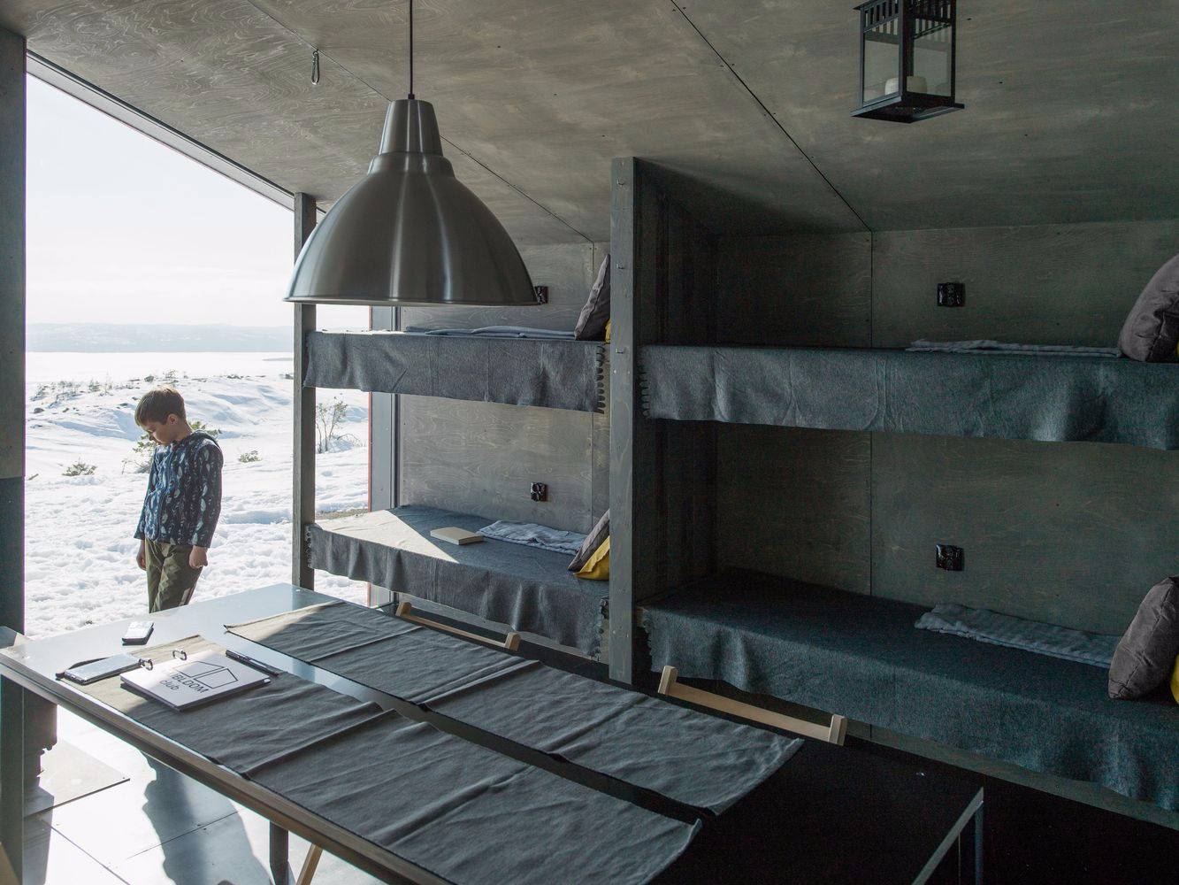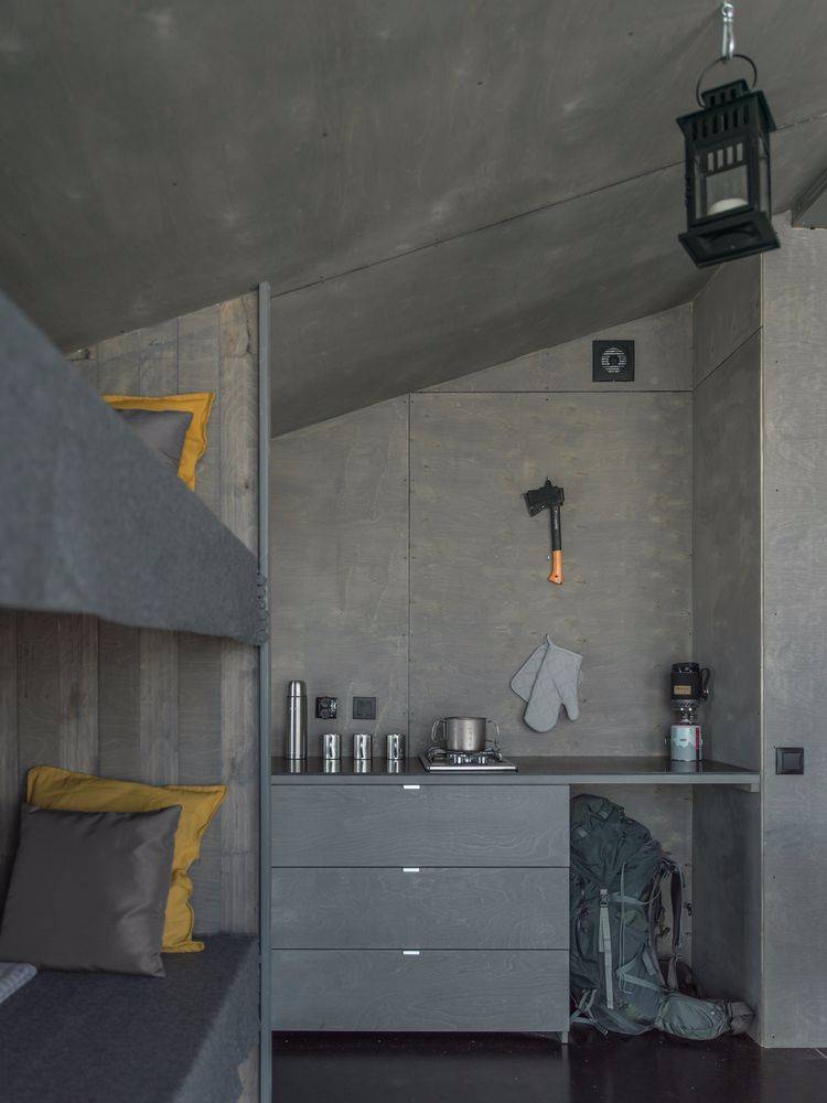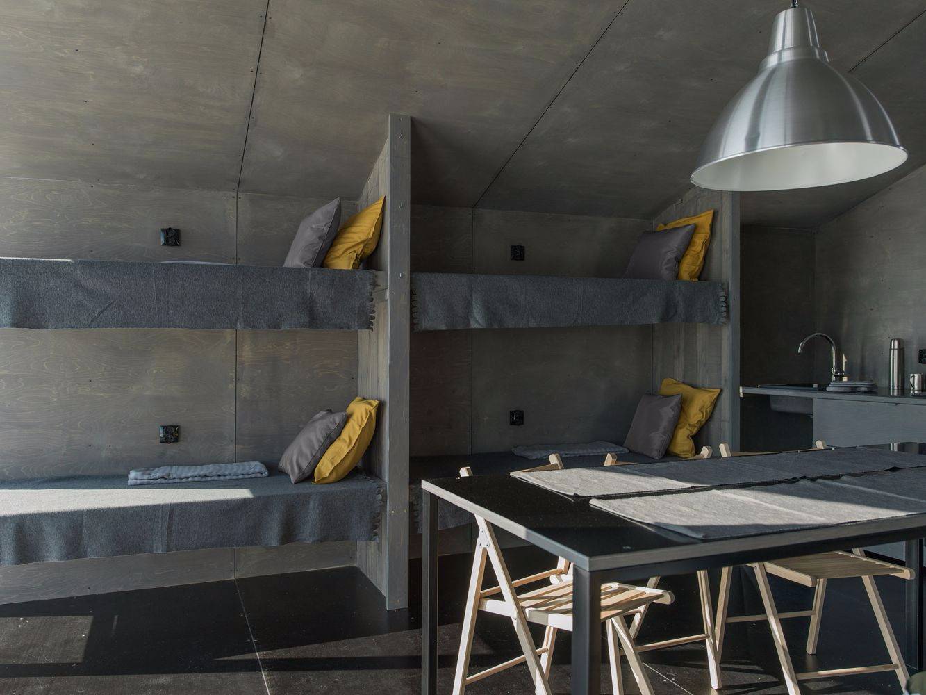 內(nèi)部空間可以同時為8人使用。架床環(huán)繞在中央房間周圍,中間是一張大家可以圍坐在一起的桌子。所有的架床都可以被拆下來,床下面的空間為儲物而設計。大廳可以用來存放外衣。室內(nèi)的色調(diào)盡可能地簡約,讓人們把注意力都留給窗外的山景。