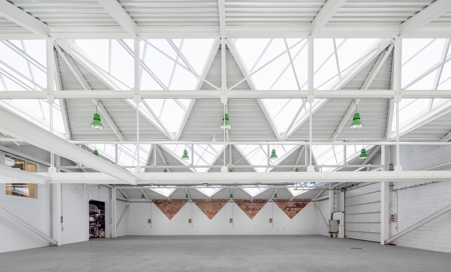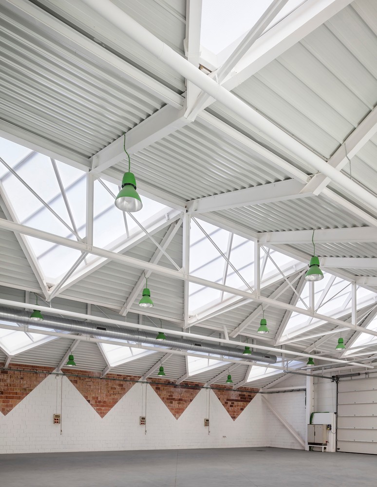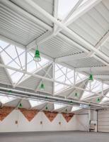 另一方面,新工廠中另一座新建的625平方米的開放式建筑,通過其周邊支柱支撐的輕質(zhì)鋼結(jié)構(gòu)來適應(yīng)梯形平面的局限性。 支撐屋頂?shù)慕Y(jié)構(gòu)框架與一系列朝北的三角形天窗相結(jié)合,從而以自然的方式照亮內(nèi)部空間。建筑的外部空間與周圍環(huán)境相融合,因而更加強(qiáng)調(diào)情境感,從而與內(nèi)部空間的輕盈感形成鮮明的對(duì)比。