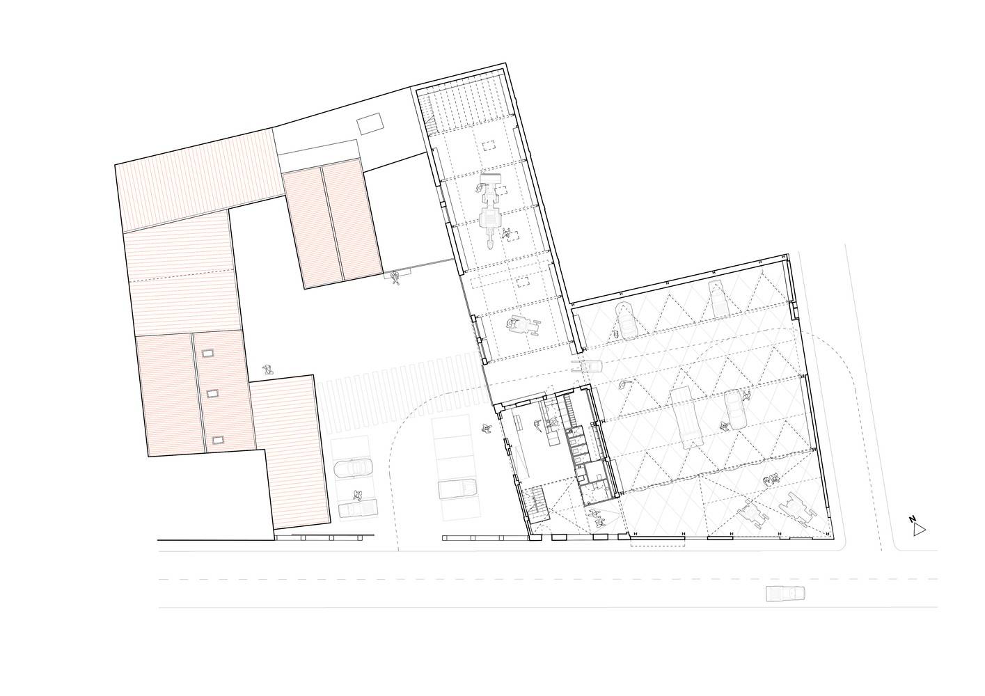首先,新工廠的主體結(jié)構(gòu)是根據(jù)原始建筑結(jié)構(gòu)的主要軸線而設(shè)計(jì)的。保留舊建筑結(jié)構(gòu)的方向和模塊,連接兩座建筑,同時(shí)將梯形平面的斜邊以相同的方式分解,從而實(shí)現(xiàn)建筑結(jié)構(gòu)主立面的幾何形態(tài)。