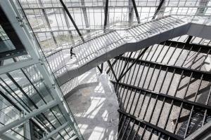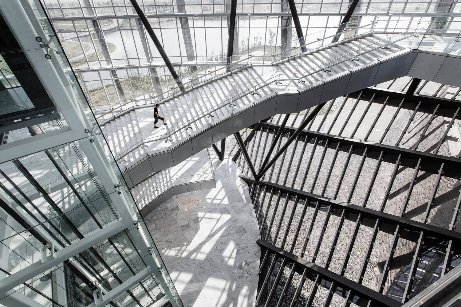 進(jìn)入大廳后,碩大的帷幕玻璃將東側(cè)優(yōu)美的湖景盡收眼底。一座寬廣的樓梯引領(lǐng)參觀者緩步而上,抵達(dá)虛、實(shí)量體交會(huì)處之導(dǎo)覽空間,一系列的精美展示由此開(kāi)始。
