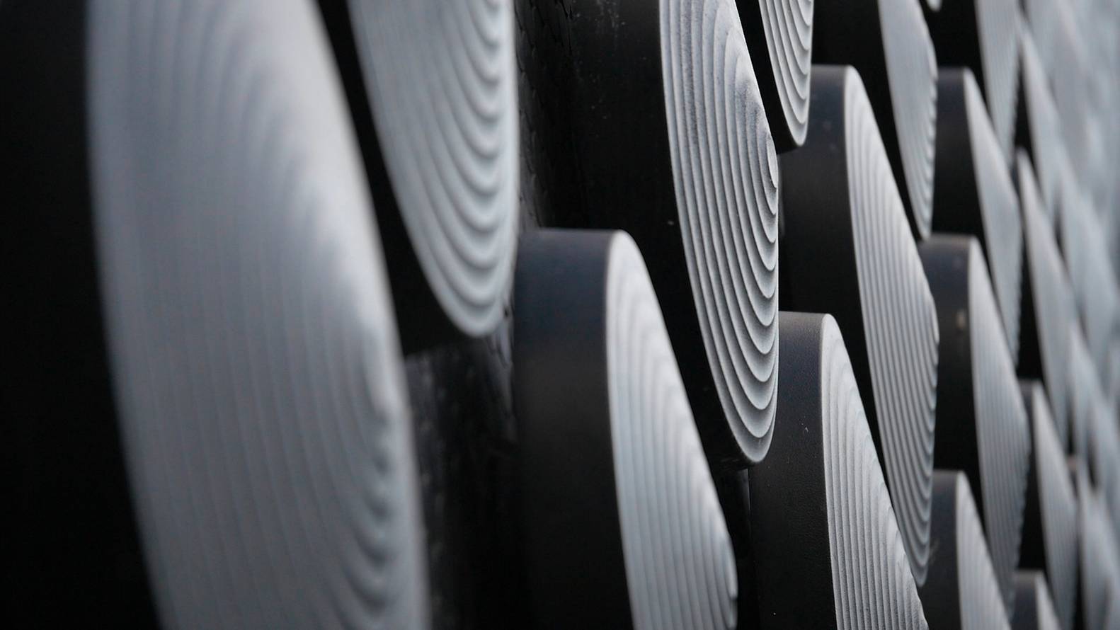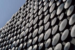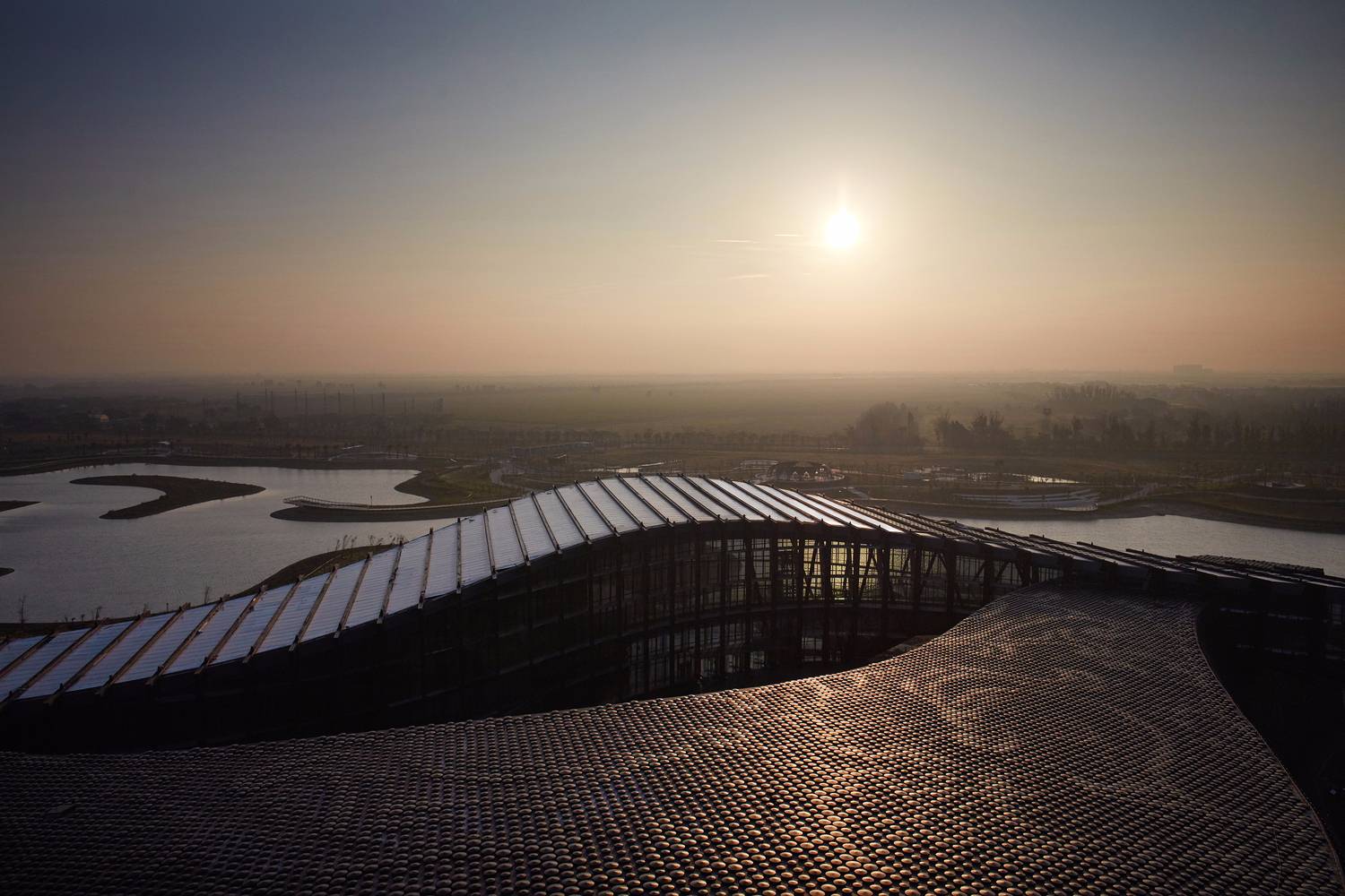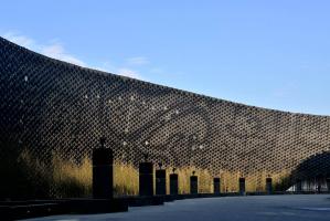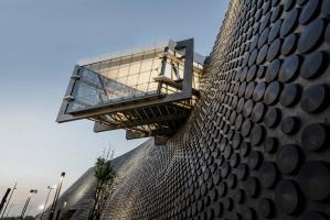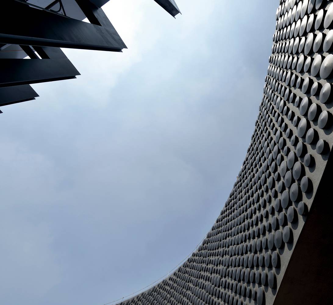 實(shí)量體建筑的外觀由36,000多片鑄鋁圓盤外掛于弧型墻面所構(gòu)成,以現(xiàn)代數(shù)碼化的設(shè)計(jì)呈現(xiàn)古老銅器上的龍紋及云紋。當(dāng)陽(yáng)光移動(dòng)時(shí),經(jīng)由圓盤的反射,“在云中移動(dòng)的龍”會(huì)在此獨(dú)特設(shè)計(jì)的弧形立面上呈現(xiàn)出來(lái)。