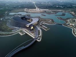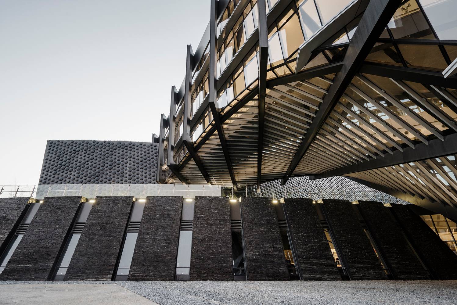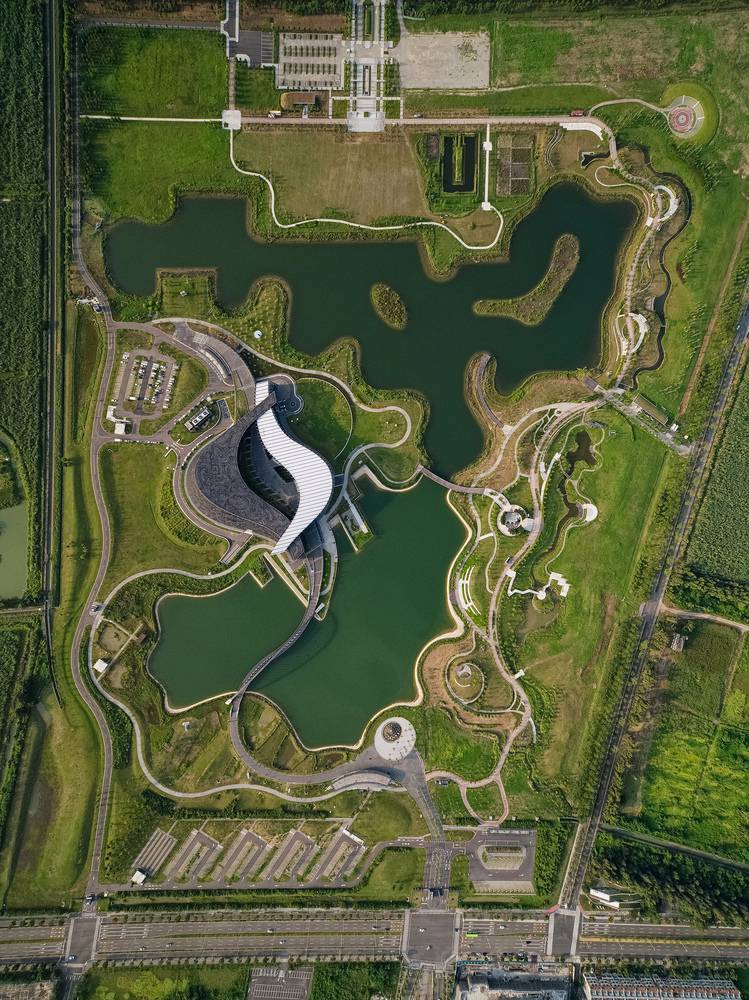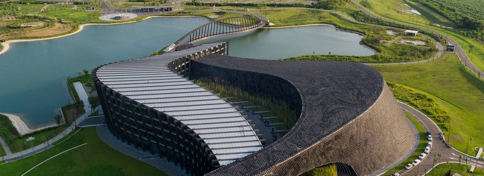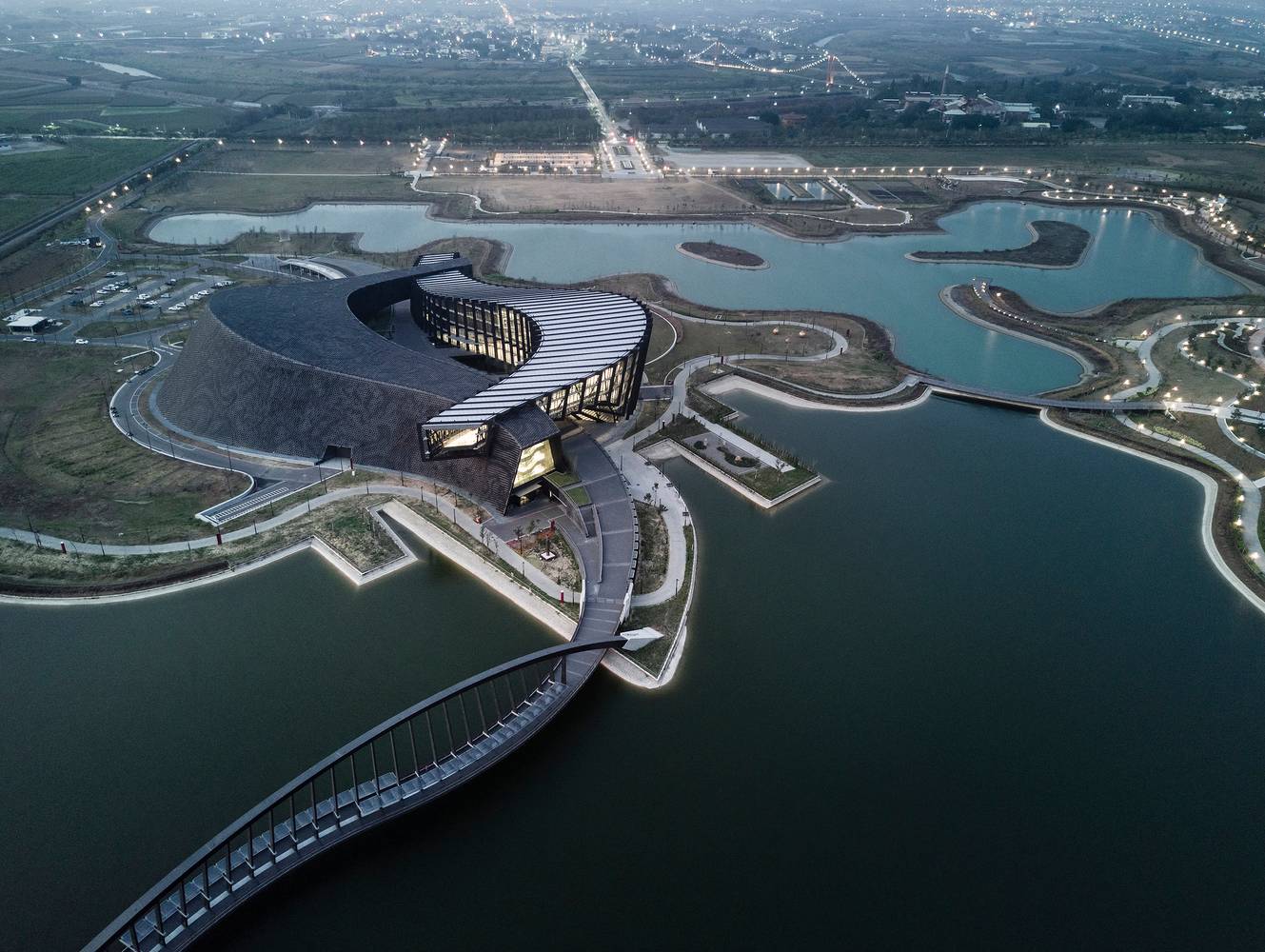 藉由代表中國(guó)書(shū)法中濃墨、飛白、渲染三種筆法,此博物館建筑由三座流線型量體交織而成,在嘉南平原一片綠色的蔗田與稻田之中,顯現(xiàn)出墨黑色行云流水般的流動(dòng)造型。