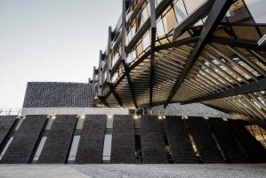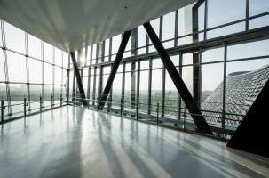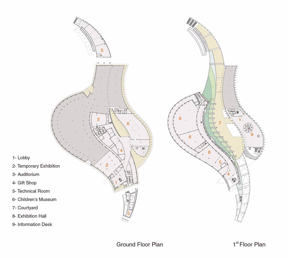 這三個(gè)各具特色的造型具有不同的功能:由于典藏品對(duì)自然光相當(dāng)敏感,因此實(shí)量體(源自濃墨)主要為典藏與展示空間;玻璃與鋼柱所形塑的虛量體(源自飛白)中,則為大廳、餐飲、圖書(shū)館、辦公室等空間;而第三筆劃的渲染穿越過(guò)前兩個(gè)交織的造型,將所有的空間聯(lián)系起來(lái)。