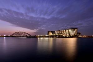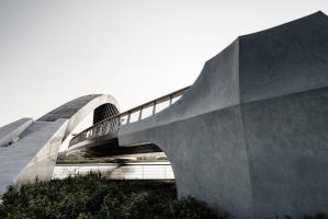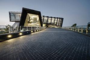 參觀者抵達(dá)博物館正門時(shí),會(huì)從湖的對(duì)岸看見(jiàn)這座主體建筑。走過(guò)整體設(shè)計(jì)的弧形的步道橋,從虛量體下方進(jìn)入一個(gè)種滿竹子的寧?kù)o中庭,參觀者在此準(zhǔn)備進(jìn)入館內(nèi)參觀。