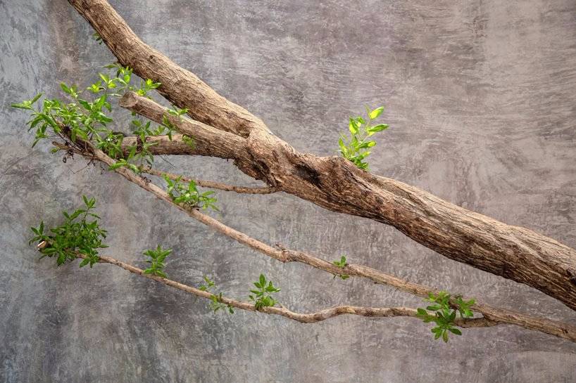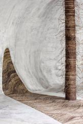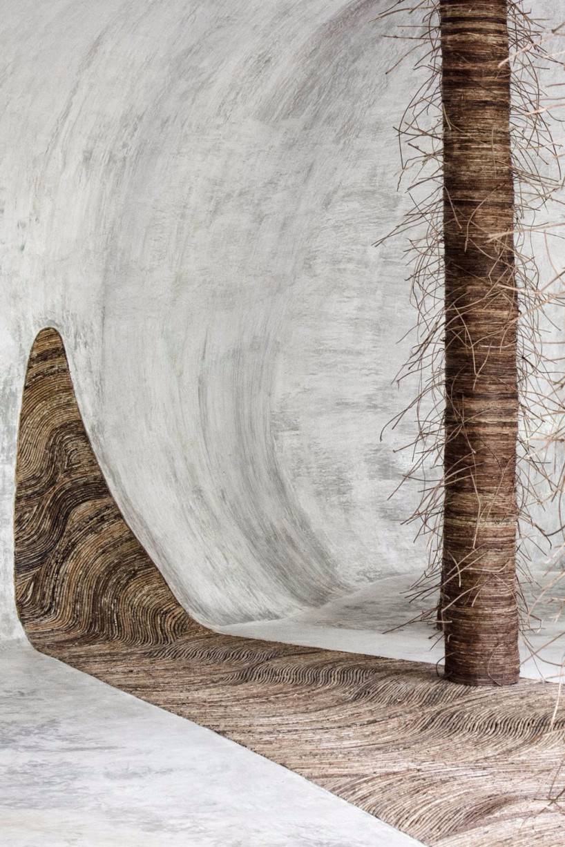 畫廊內(nèi)部空間與大多數(shù)藝術(shù)空間毫無裝飾的美學(xué)特征大相徑庭,邀請參觀者赤腳走入其中,將地面視作生物體并與之互動(dòng)。從拋光水泥到未經(jīng)處理的貝喬科(當(dāng)?shù)卦a(chǎn)的一種藤蔓植物)木質(zhì)地板,從熱到冷不斷變化的溫度讓人們將焦點(diǎn)聚集在周邊自然之中。