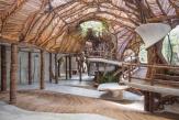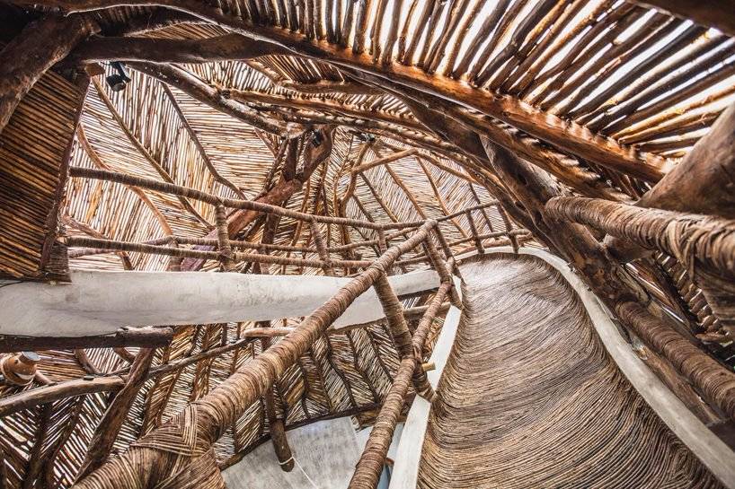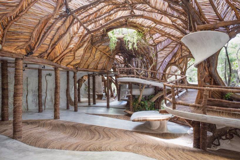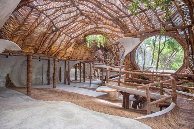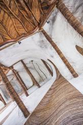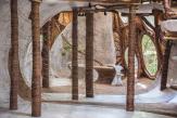這座畫廊坐落在生態(tài)環(huán)境友好的azulik 度假村,是度假村創(chuàng)始人以及自學(xué)成才的建筑師jorge eduardo neira sterke腦力勞動(dòng)的結(jié)晶。盡管設(shè)計(jì)中大量使用了木材,但在空間結(jié)構(gòu)部分則沒有使用一棵樹,空間由一系列扭曲、波狀起伏的地面以及門廊組成。大面積圓窗將自然光引入室內(nèi),光線滲透到整個(gè)墻壁圍合成的空間中,墻壁則利用透明玻璃纖維進(jìn)行加固。