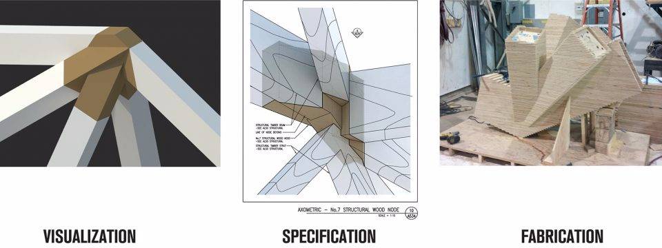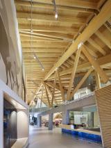 博物館形如雕塑的獨特造型是通過創(chuàng)新性的大型木柱系統(tǒng)而實現的,該系統(tǒng)依靠節(jié)點形成連接,是結構工程師和制造商密切合作的成果。除了承擔復雜的3D建模和立柱節(jié)點設計之外,建筑團隊還與制造商共同開發(fā)了一套能夠將復雜的幾何結構通過數控切割為平面的系統(tǒng),使其能夠通過層壓的方式進行組合。可伸縮的鋼制硬件被預先置入立柱的節(jié)點當中,然后再在現場進行裝配。最終的結構對博物館的空間表達起到了至關重要的作用,同時也展示了可持續(xù)木材技術的顯著進步。
