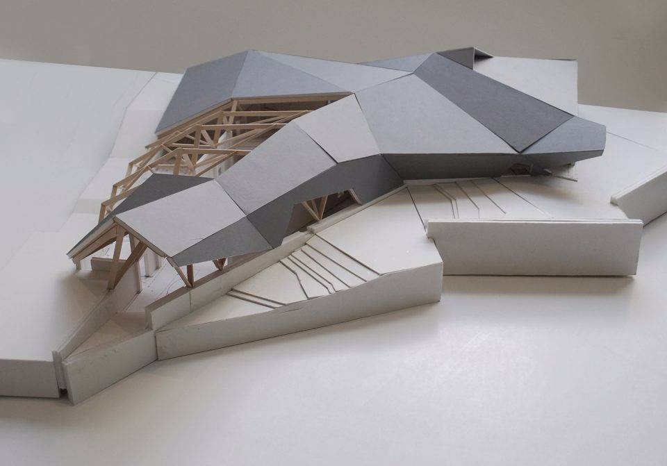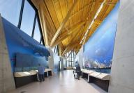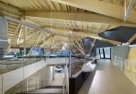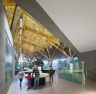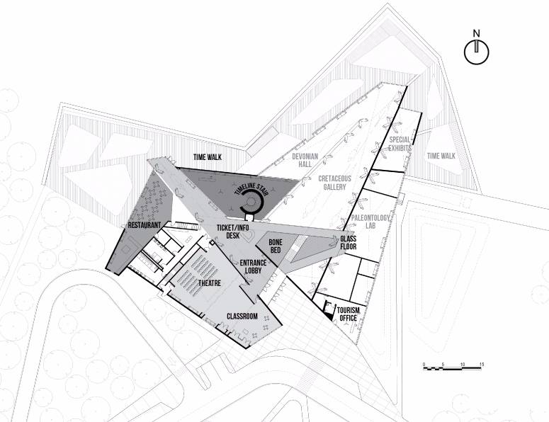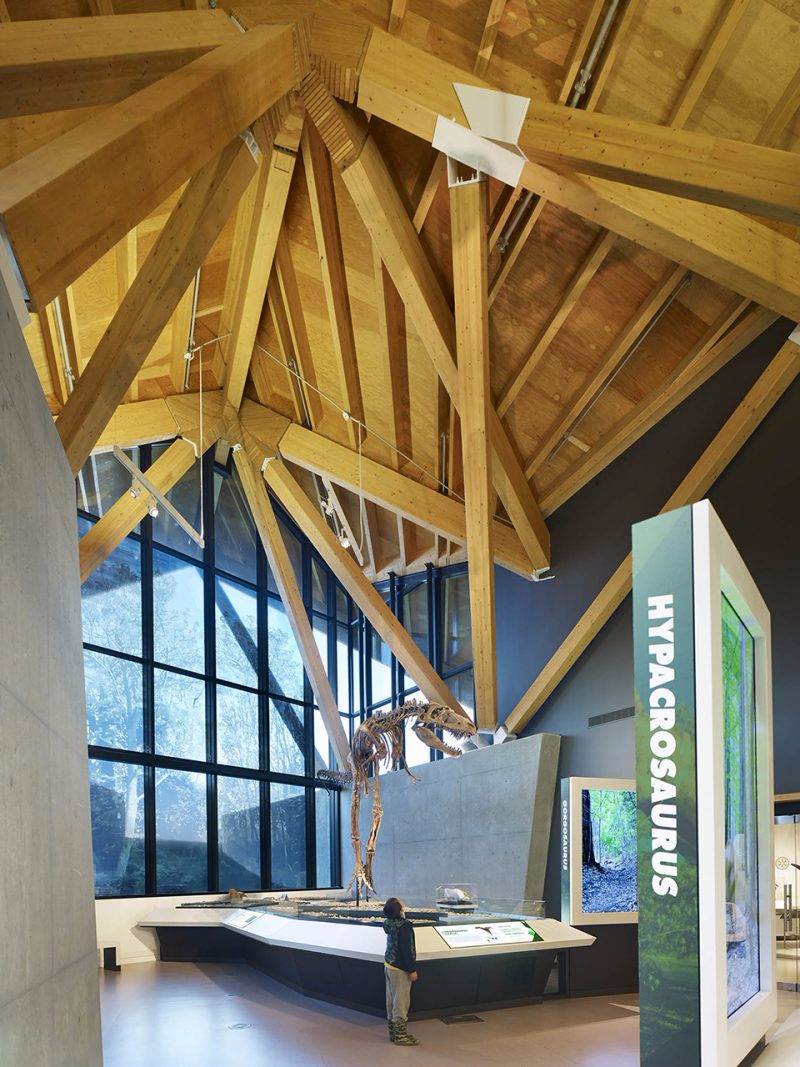 博物館采用了與形式封閉的傳統(tǒng)展覽空間截然不同的設計,為游客帶來一系列敘事性的建筑空間:以倒敘的方式呈現了從當地教師意外發(fā)現骨床到骸骨復原的過程,以及關于史前地球情境的沉浸式體驗(其中包括Pachyrhinosaurauas Lakustai恐龍的發(fā)現過程)。展覽的終點是恐龍世界所在的泥盆紀大廳(Devonian Hall)。建筑的結構和空間布局引用了專門用于考古學野外作業(yè)的保護性結構的形態(tài),共同構成并促進了整體的敘事。內部空間選用了天然的木材,地下的樓層則以混凝土來展示地層和化石的重量感。參觀者將隨著時間線逐步深入旅程,玻璃地面和窗戶還將呈現古生物實驗室內的景象,使人們了解到博物館正在進行的重要研究。