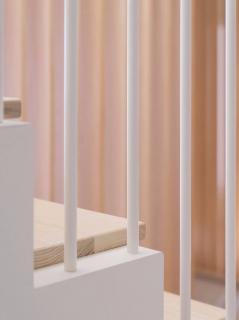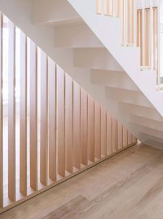 帶木質(zhì)踏板的白色鋼樓梯通往開放的公共區(qū)域。在這里,雙層高度的空間通過玻璃幕墻獲得充足的光線,并朝露臺(tái)開放。