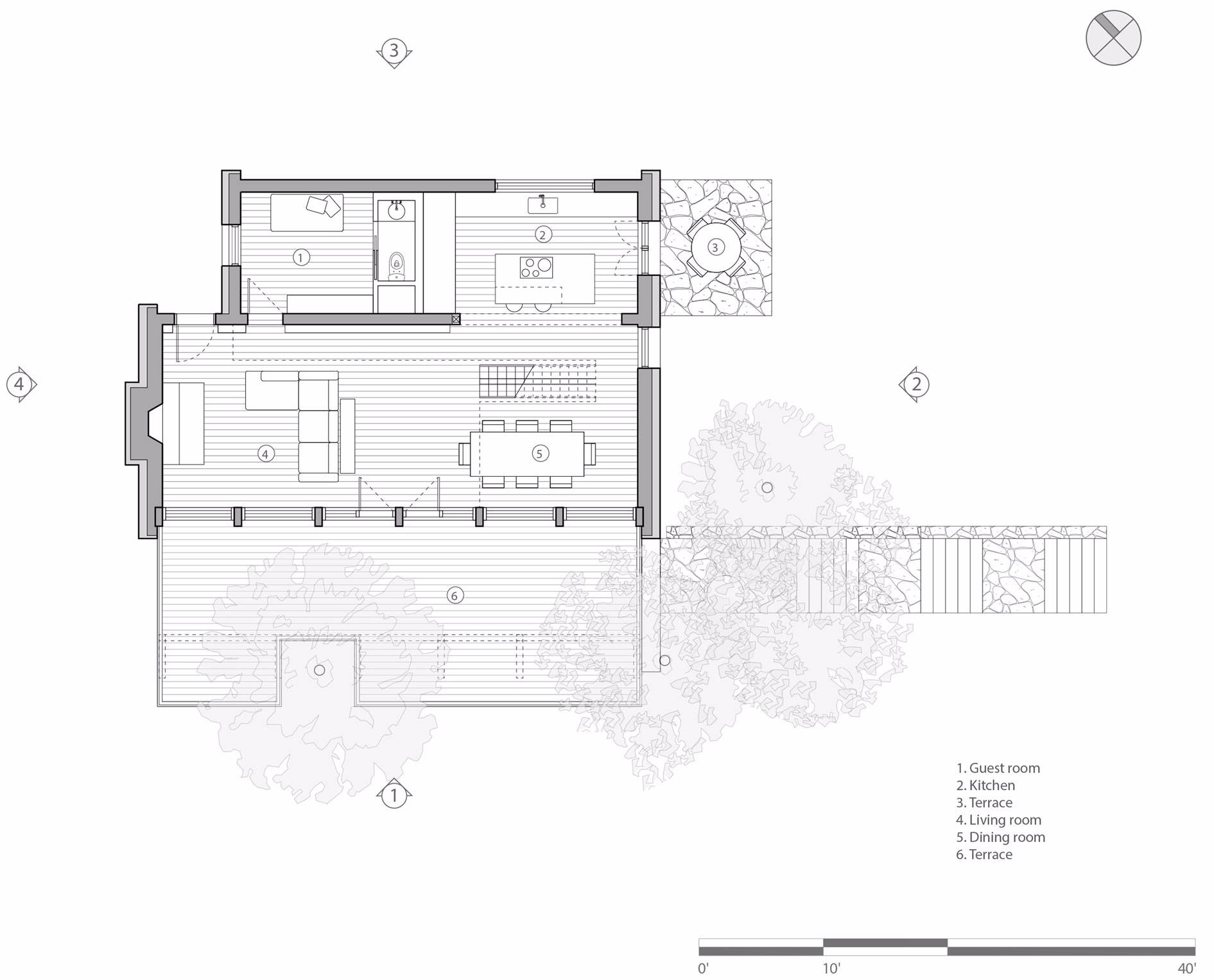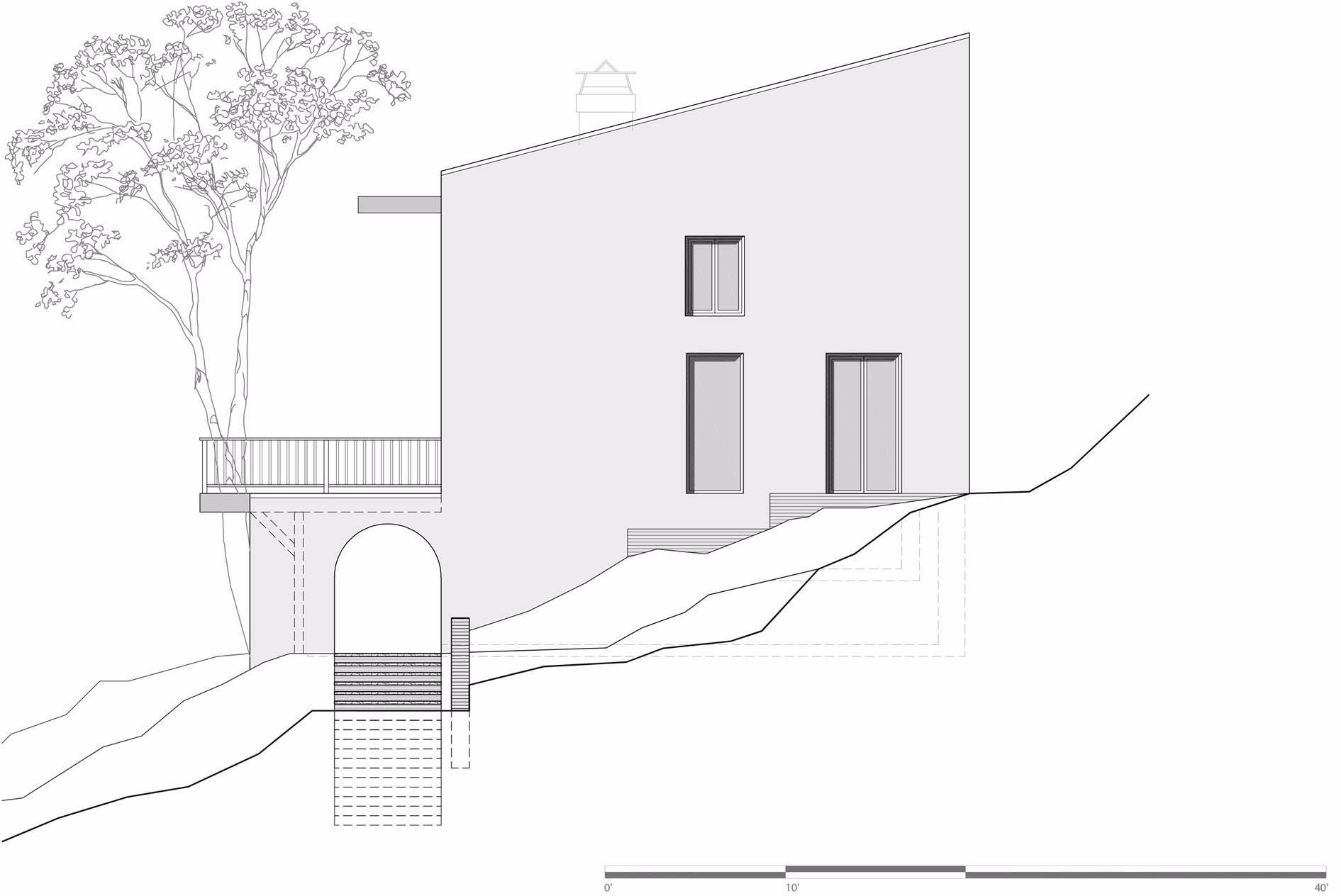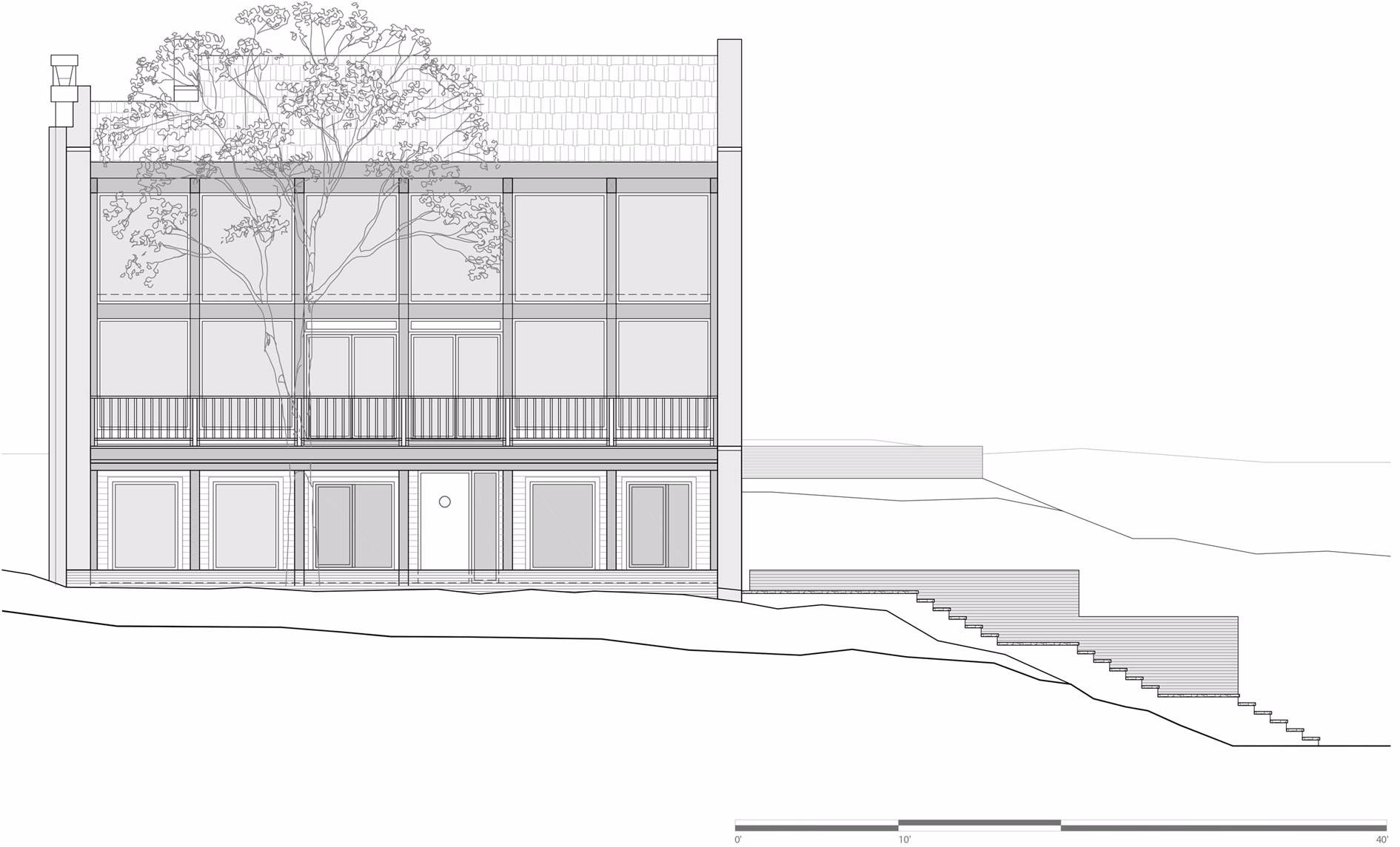 較低的樓層局部嵌入景觀之中,包含客房,家庭活動(dòng)室和服務(wù)區(qū)域,如洗衣房和儲(chǔ)藏室。