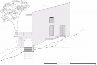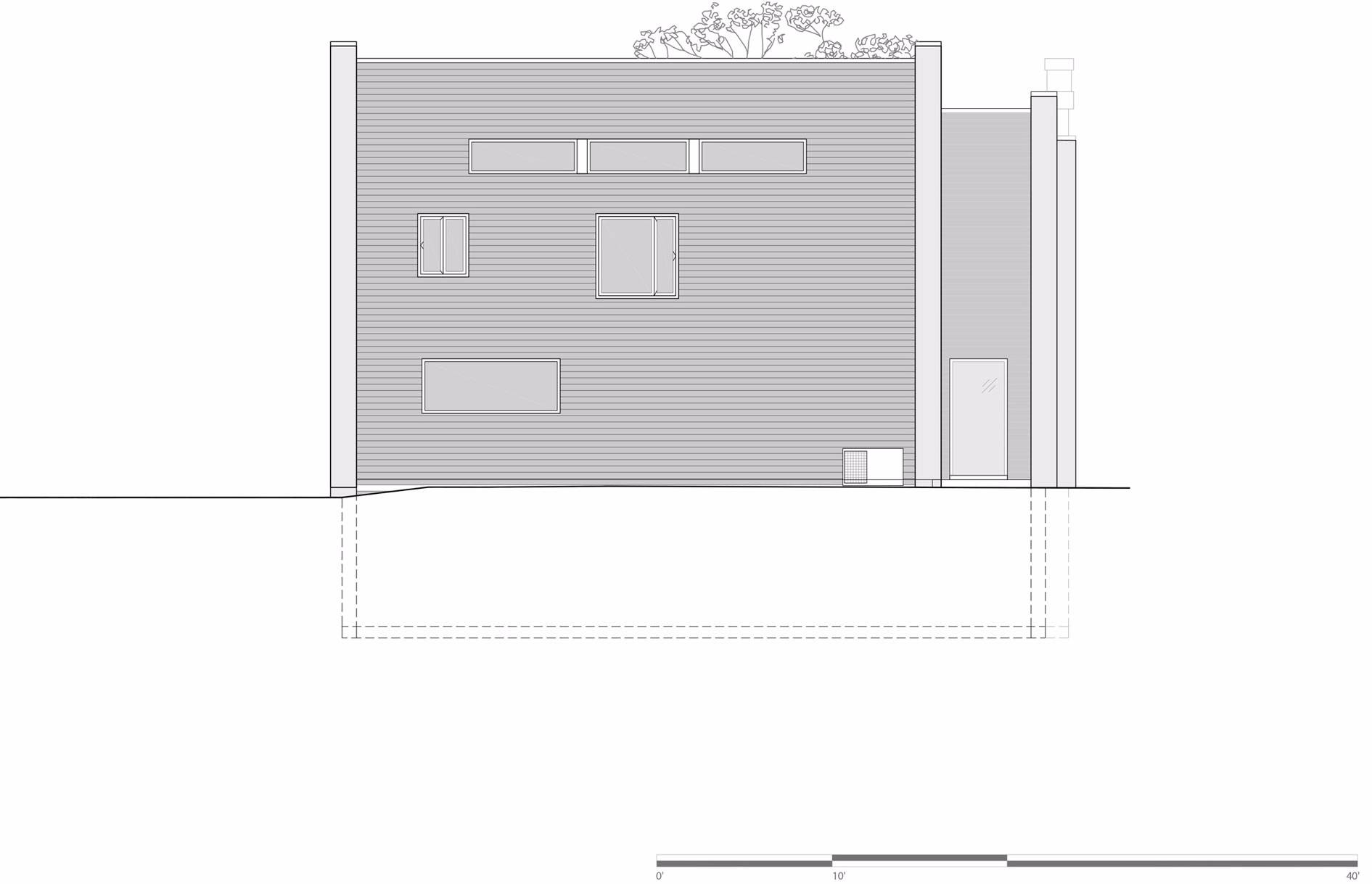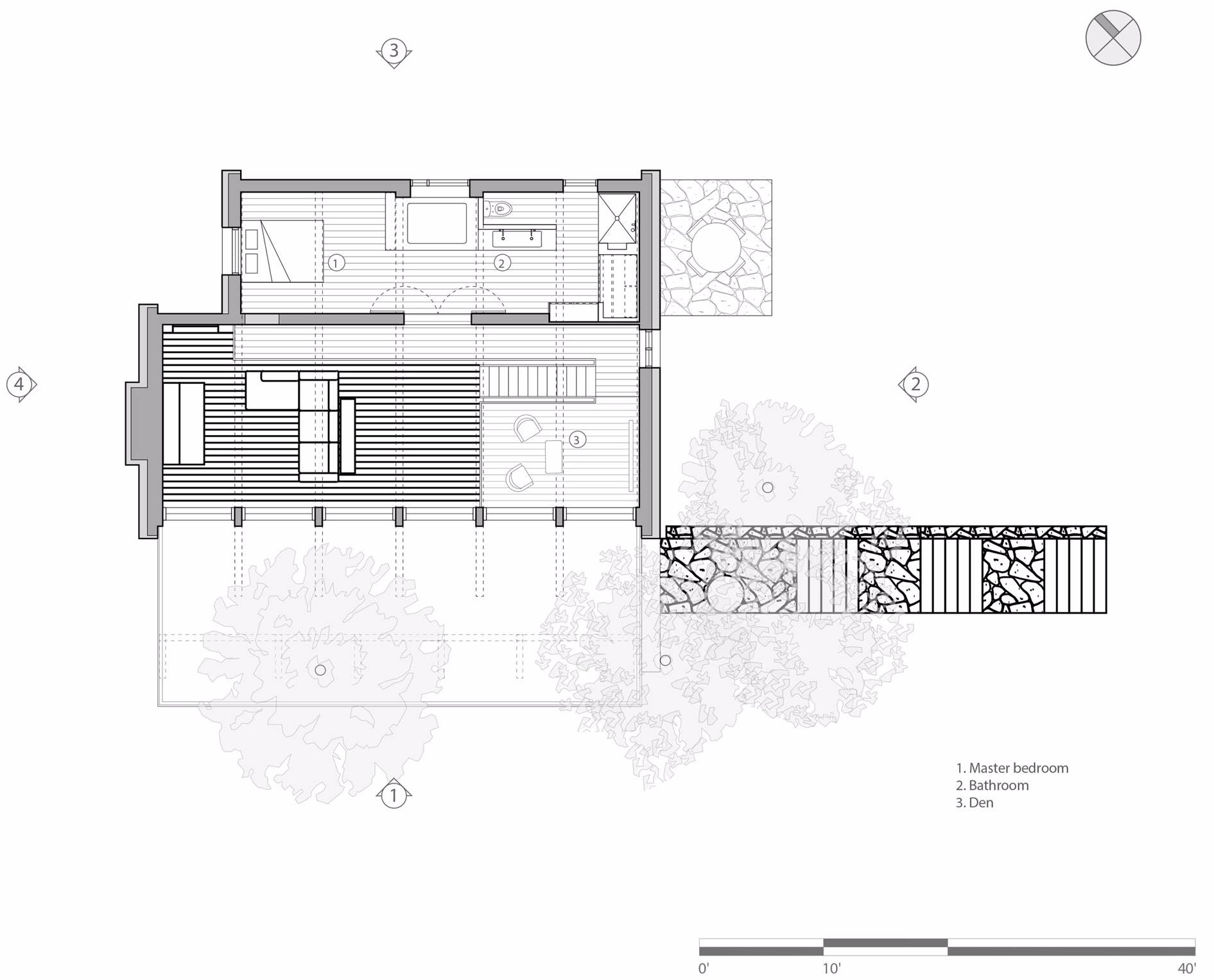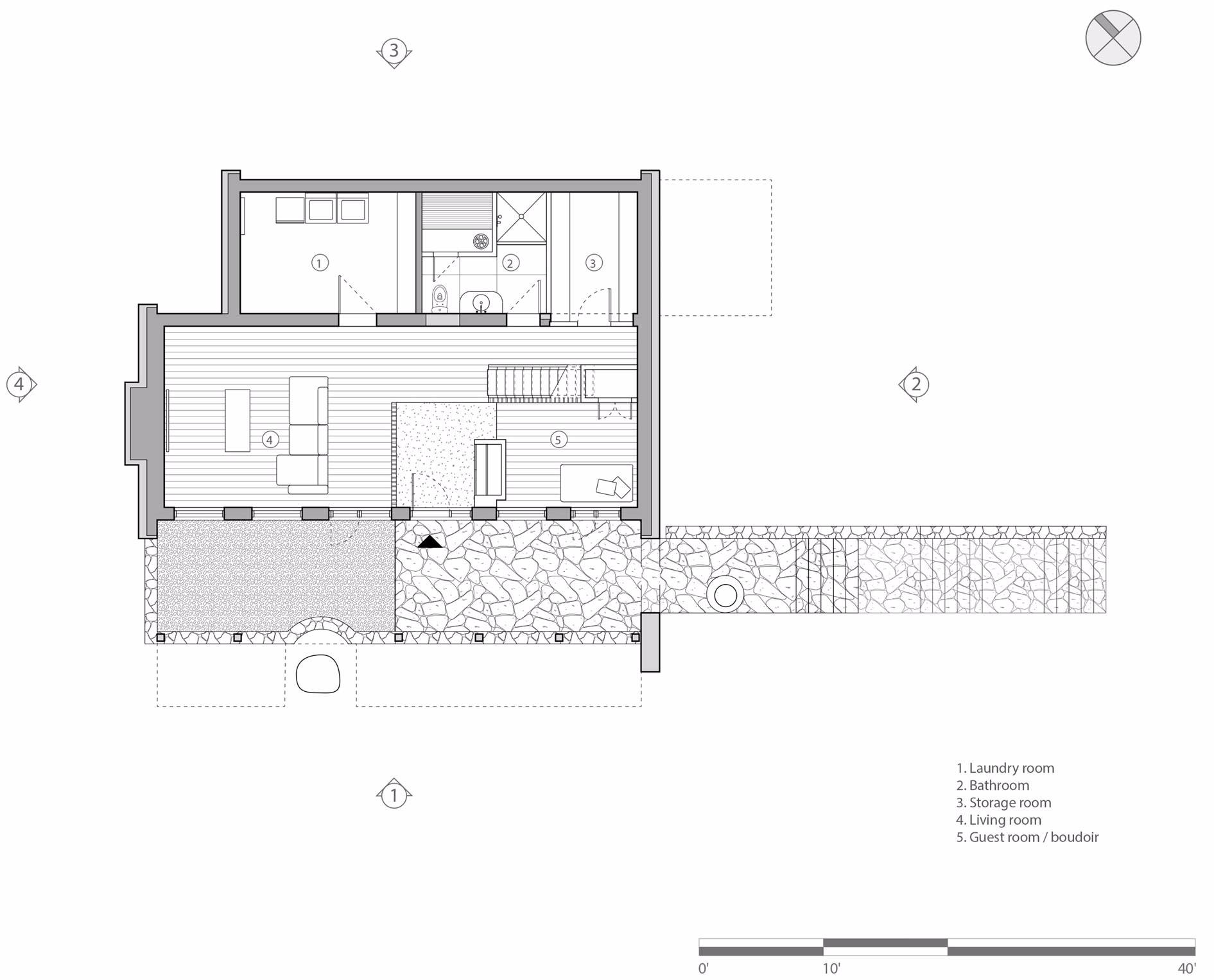 較低的樓層局部嵌入景觀之中,包含客房,家庭活動(dòng)室和服務(wù)區(qū)域,如洗衣房和儲(chǔ)藏室。
