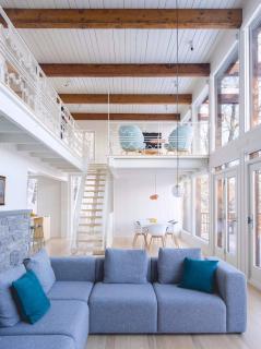 在這個(gè)房間里,建筑師們修復(fù)了一面遺留下來的巨大石墻,以及夾層上裝飾著古怪幾何圖案的鋼欄桿。除了廚房,客廳和餐廳之外,這層還有另一間客房。