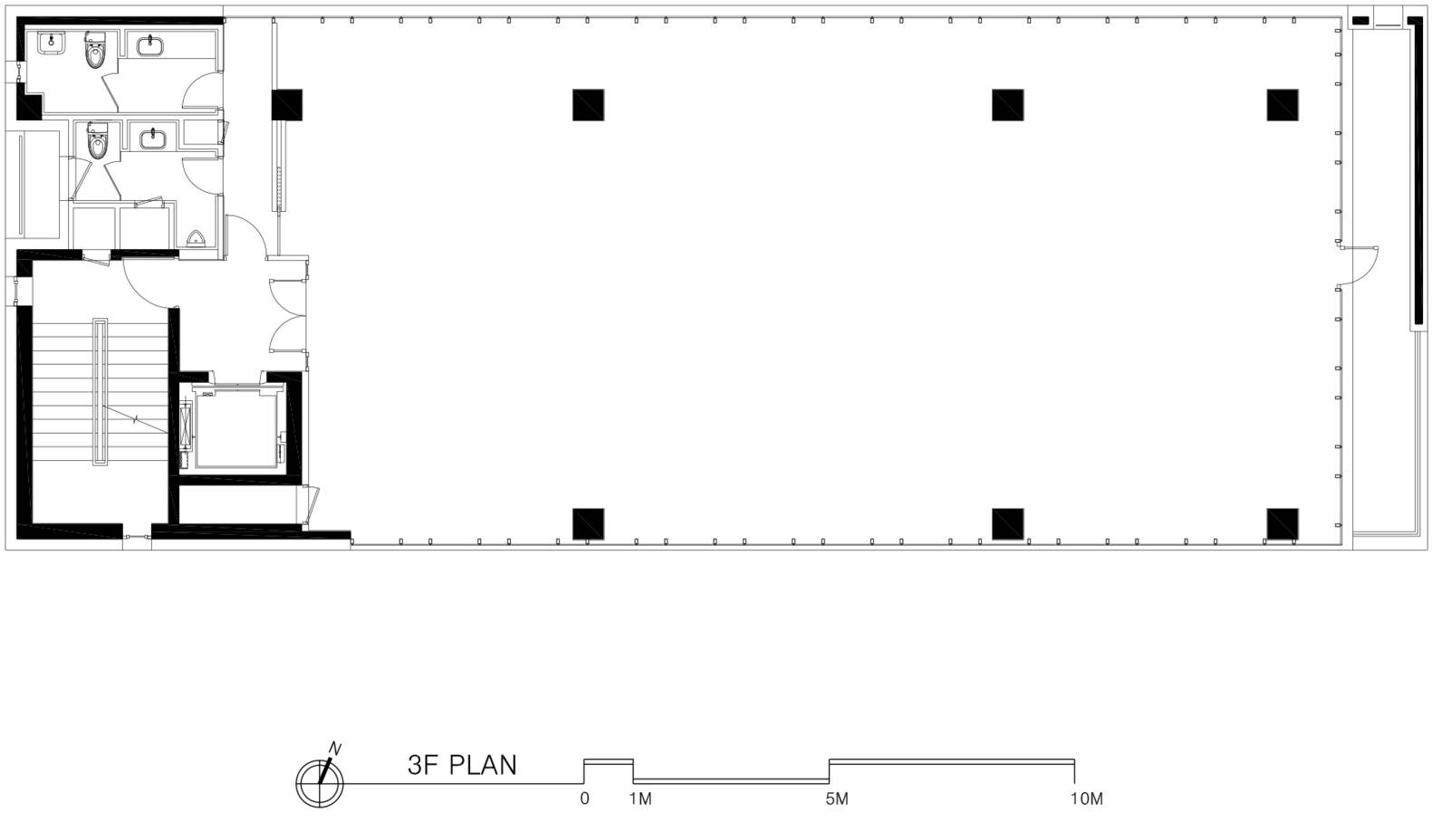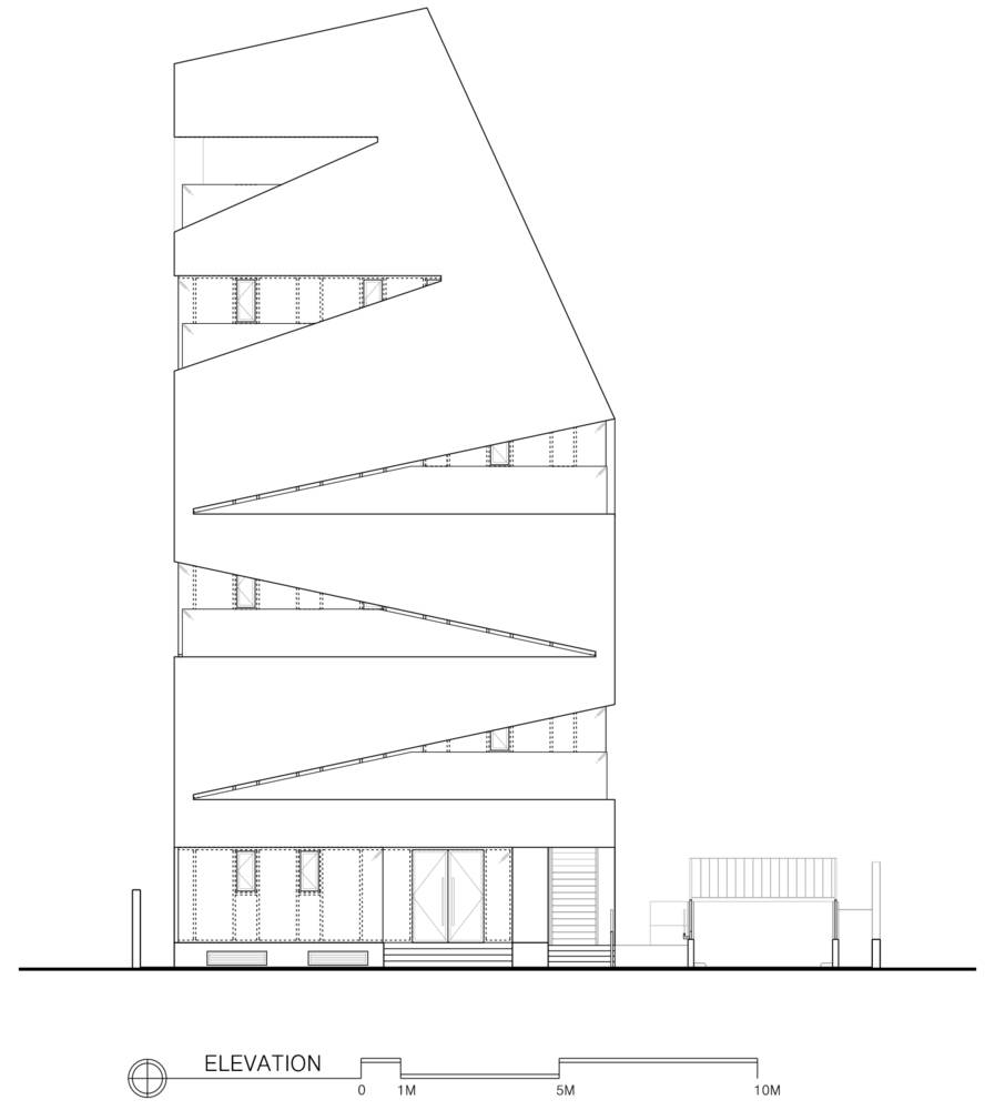 場地東西朝向。場地狹窄的一面連接著道路,所以場地內(nèi)有更長的步行距離。從商業(yè)區(qū)和步行者的方向來看,建筑從一樓和二樓進(jìn)入,樓梯間和電梯位于建筑物內(nèi)部。建筑物業(yè)主的目的是出租空間,然而建筑物并不是可以在沒有用戶的情況下獨立存在的。建筑的使用應(yīng)該從用戶的觀點來看,并且可以由用戶的想法來改變。取決于用戶的想法,它可以是餐館或辦公室。建筑師的意圖是響應(yīng)設(shè)計的改變,并期望建筑能以多種而非單一的方式構(gòu)建。
