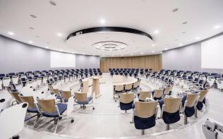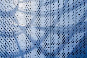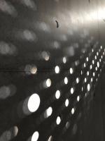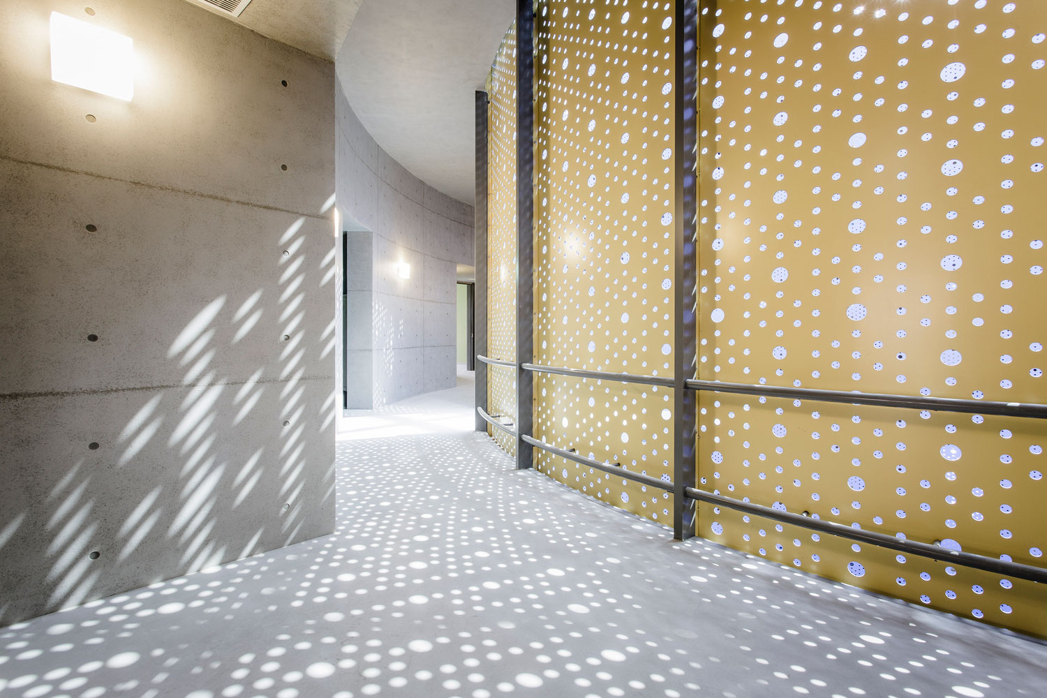 中庭內(nèi)立面以寰宇星體的羅列為概念,透過(guò)金屬?zèng)_孔板的設(shè)計(jì)呈現(xiàn);同時(shí)適度提供通廊的視覺(jué)穿透性、降低空間壓迫感及減少中庭回音的現(xiàn)象,也增加各樓層間使用者的互動(dòng)機(jī)會(huì)。