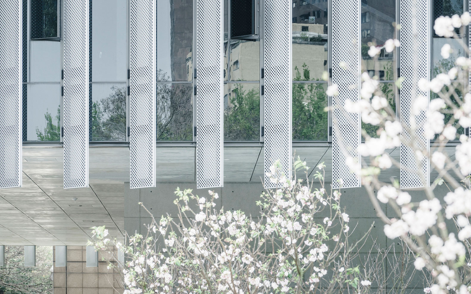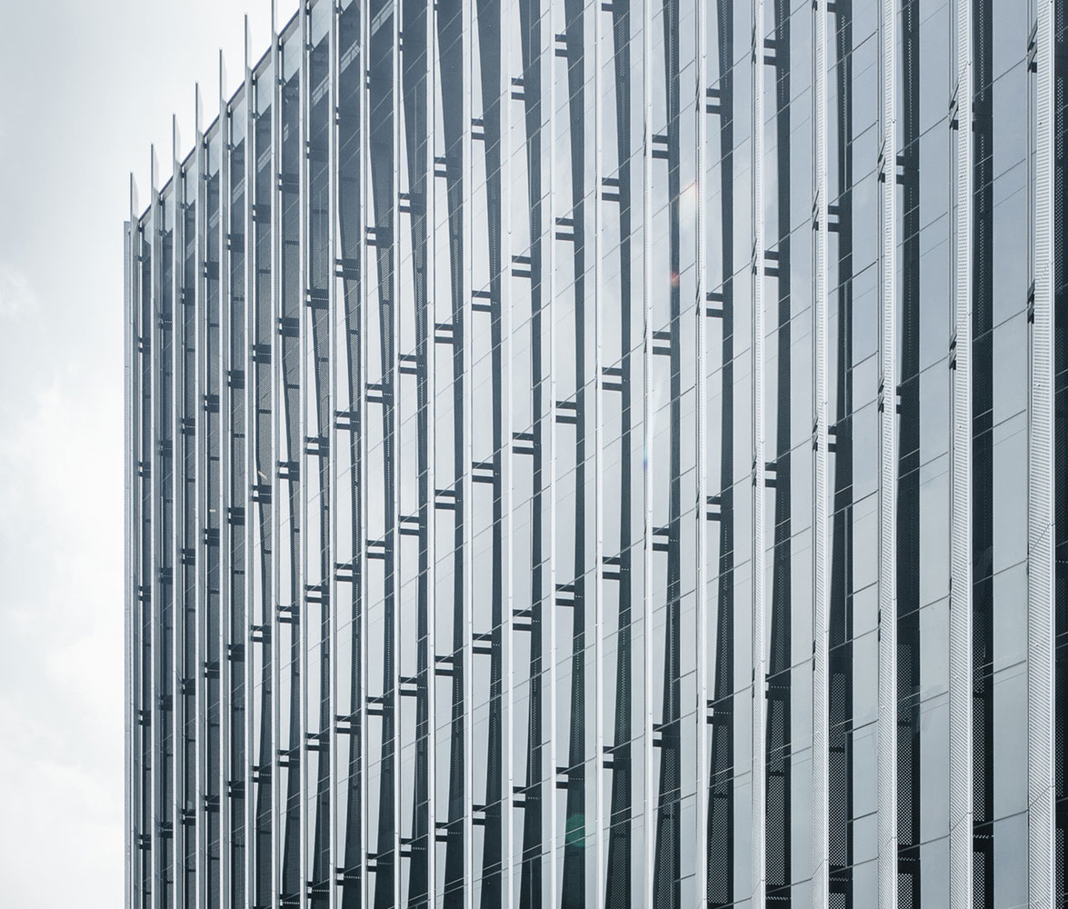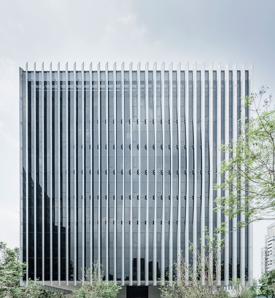 并以「隱含的球體」作為立面設(shè)計(jì)概念,由垂直向度不同寬窄序列漸進(jìn)的遮陽(yáng)板創(chuàng)造出逐漸現(xiàn)型的天圓,當(dāng)人們移動(dòng)觀看時(shí),即可感受到立面動(dòng)態(tài)、漸變的視覺(jué)經(jīng)驗(yàn)。