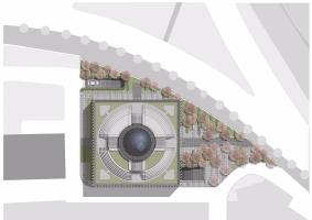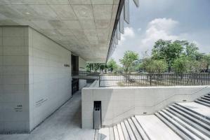 臺(tái)灣大學(xué)宇宙學(xué)館配合周邊環(huán)境的和諧,建筑物出入口以十字軸向外延伸,于東側(cè)設(shè)置廣場(chǎng),接續(xù)現(xiàn)有的榕樹(shù)廣場(chǎng)。