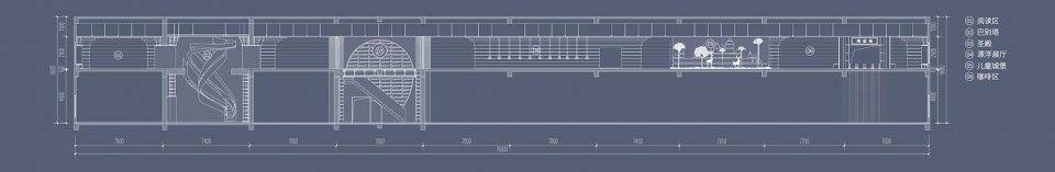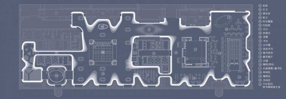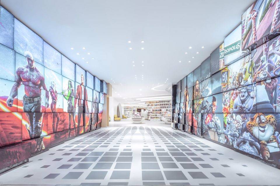 西安鐘書閣保證了傳統(tǒng)的核心購書區(qū)作為靜區(qū)之外,還因為與西安中影時代國際影城的合作,于是根據(jù)影院的流線與運營結(jié)合鐘書閣旗下的咖啡和簡餐服務(wù)設(shè)置了動區(qū),提供更多的餐桌與卡座。創(chuàng)新地將書店與影院兩種文化業(yè)態(tài)在動區(qū)融合在一起。讀者沿著漸變網(wǎng)格的地坪,在凹凸像素上的電影海報所創(chuàng)造的時光隧道從書店進入影院追憶似水流年。