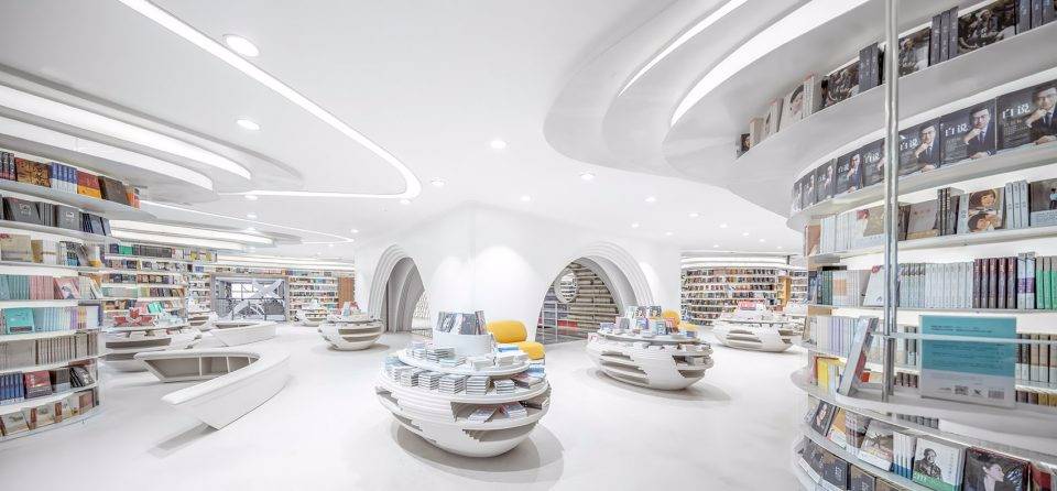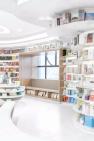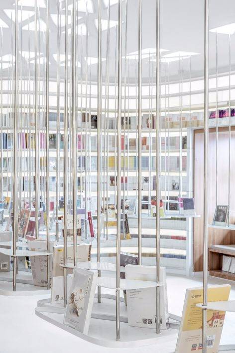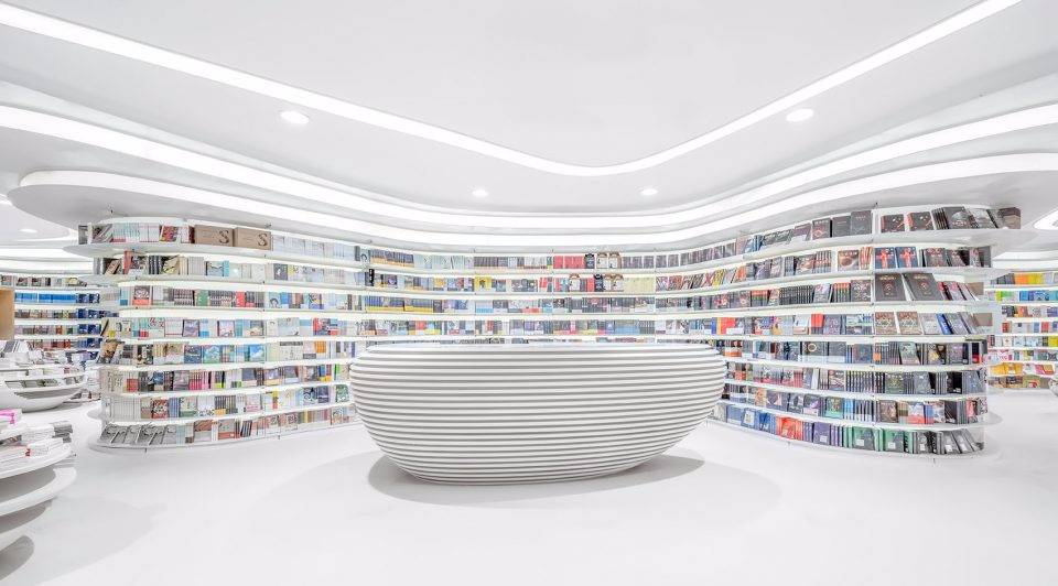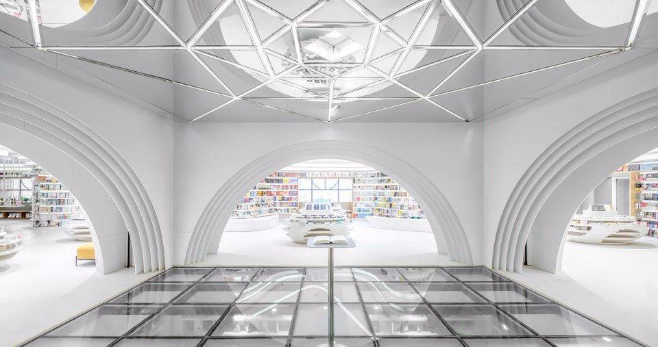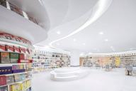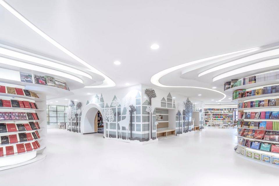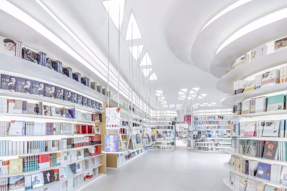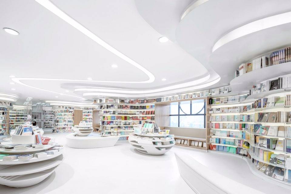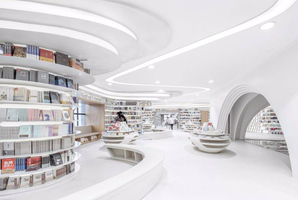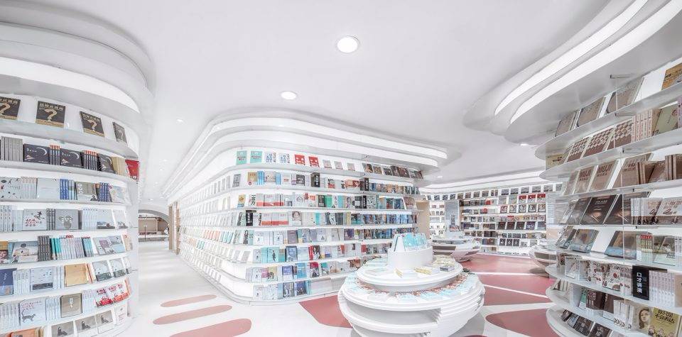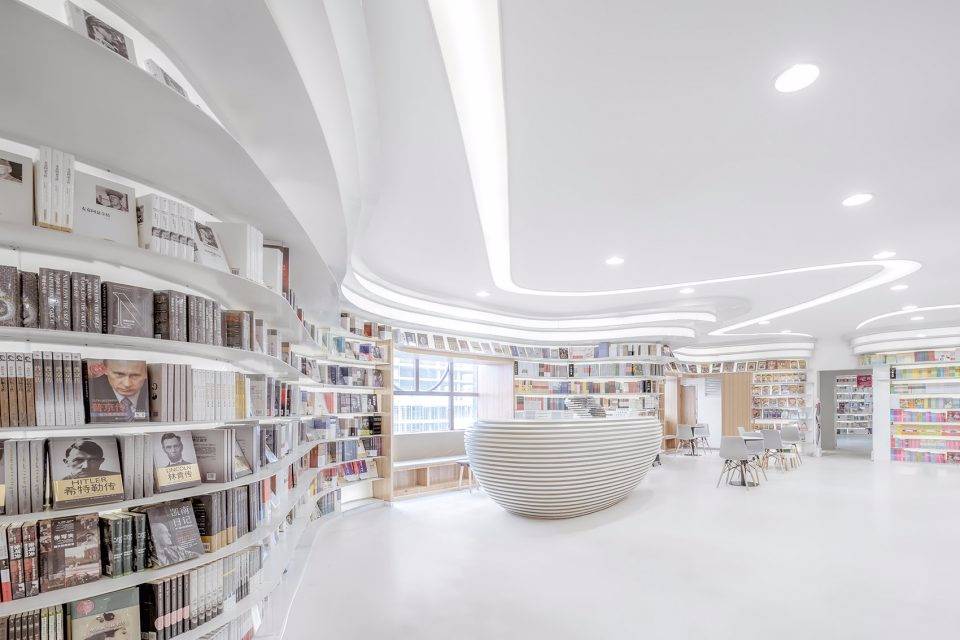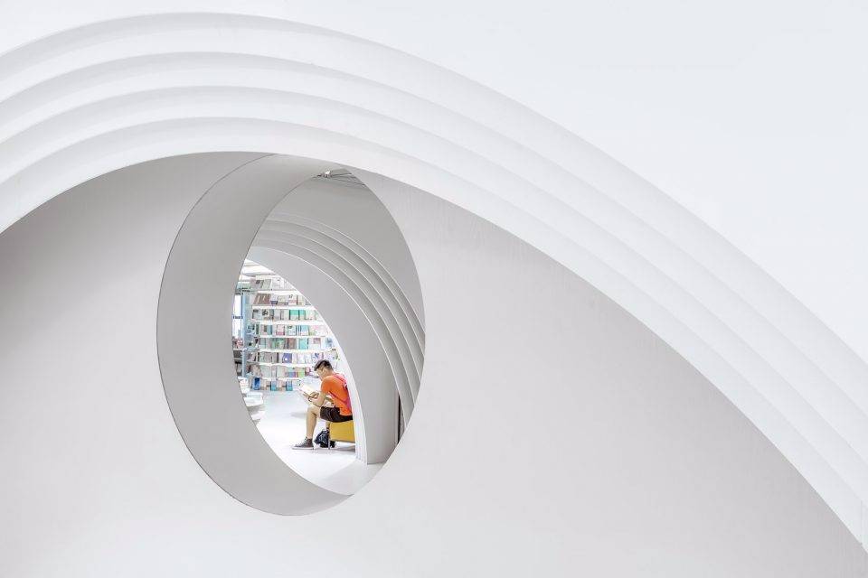 自由流動的曲線勾勒的書架總共十層,充分利用了公共閱讀區(qū)空間的各個角落,圓潤的倒角讓空間無一處尖角,背板是通體發(fā)光的透光亞克力,而白色書店的重點圖書推薦區(qū),是用纖細的螺桿懸吊三角形的鋼板,于是上面陳列的圖書仿佛漂浮在空氣中。這一系列的設(shè)計最后讓讀者恍如在云中漫步,在云間閱讀。這是鐘書閣系列書店所獨有的一個嶄新的體驗,一個在純粹之地自由自在閱讀的體驗。
