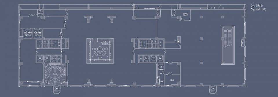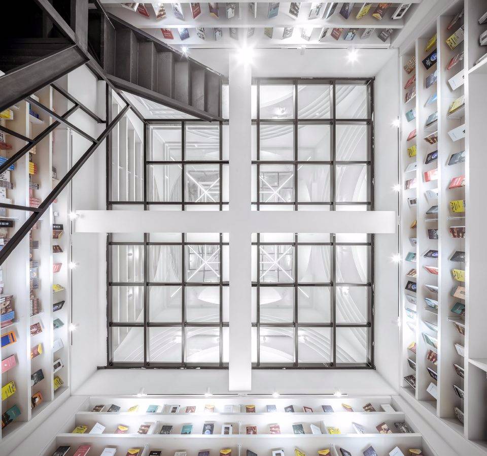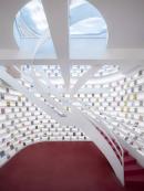 公共閱讀區(qū)的中央是神廟,層層拱券的中心,在樓板結(jié)構(gòu)梁的中央矗立著一座精致的展架,這就是鐘書閣的“每月一書”,也只能供一個人翻閱和思考。讀者的腳下的樓板被換成玻璃地板。這仿佛水面的樓板下隱藏的是空間可以提供讀書會或者會議,這個看不見的學(xué)院和看得見的神廟一起構(gòu)成了西安鐘書閣的中心,一個思想和靈魂得以煥發(fā)光輝的圣殿。