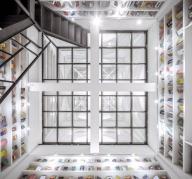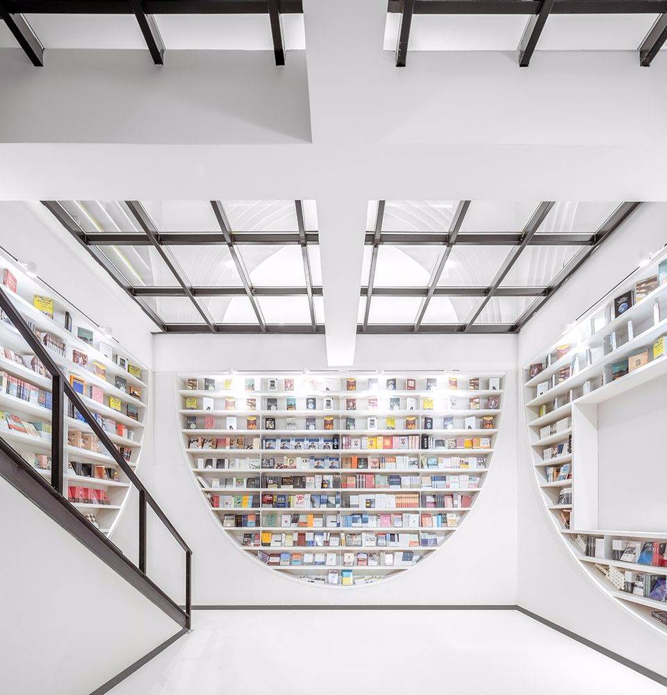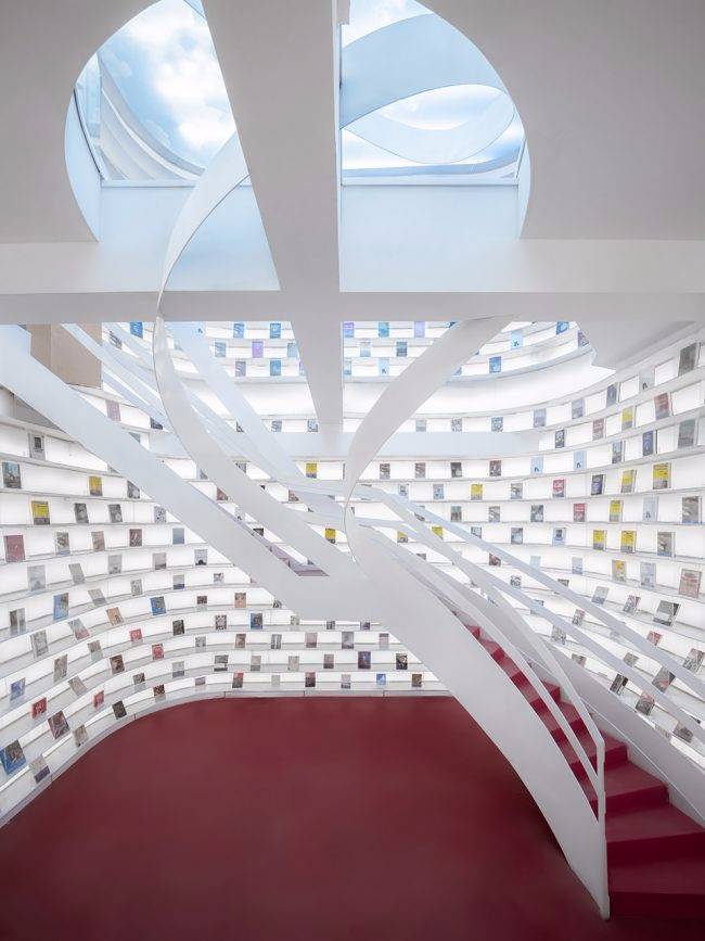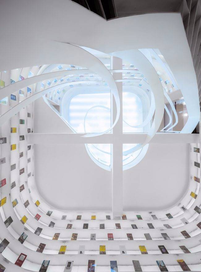 我們放棄了直接進入書店的設(shè)計,特地在四樓日常的商業(yè)空間中打造了一個閃閃發(fā)光的入口,這要求在不破壞主體結(jié)構(gòu)的前提下打通五層的樓板進入書店主要區(qū)域。我們構(gòu)筑了一個宏大的無柱的白色弧線樓梯,被一條螺旋而上的白色旋轉(zhuǎn)飄板所強調(diào),周遭環(huán)繞是定制白色亞克力所砌筑的書墻。讀者們從日常生活中而來,拾階而上,被周圍的書籍所展示的人類求知與探索精神而鼓舞,進入云中書店,可以通天。