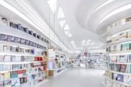 書店的基本空間由重點圖書推薦區(qū)和公共閱讀區(qū)組成。我們決定打造一個白云上的讀書天堂,它應(yīng)該具有輕盈的流線型的自由空間,加上消防規(guī)范的限制,我們不得不挑戰(zhàn)書架的傳統(tǒng)類型和材料,首次用5mm厚的鋼板來定制曲線書架。經(jīng)過精密的結(jié)構(gòu)計算,以隱藏在背后的基礎(chǔ)鋼架為支撐結(jié)構(gòu),3000多米長的鋼板書架全部以懸挑的結(jié)構(gòu)形式漂浮在空間中。為了實現(xiàn)這樣一個柔軟自由的場所,我們使用了大量時代前沿的數(shù)字化理念和技術(shù),每一片鋼板都通過編程設(shè)計優(yōu)化,由數(shù)控機床加工生產(chǎn),編號現(xiàn)場安裝。電腦輔助設(shè)計與創(chuàng)新材料讓概念變成了現(xiàn)實。