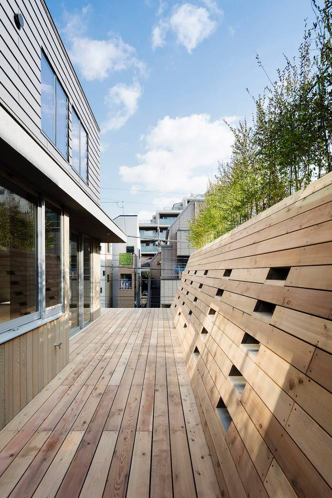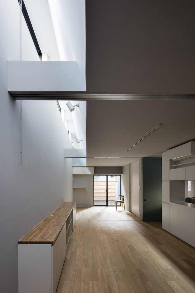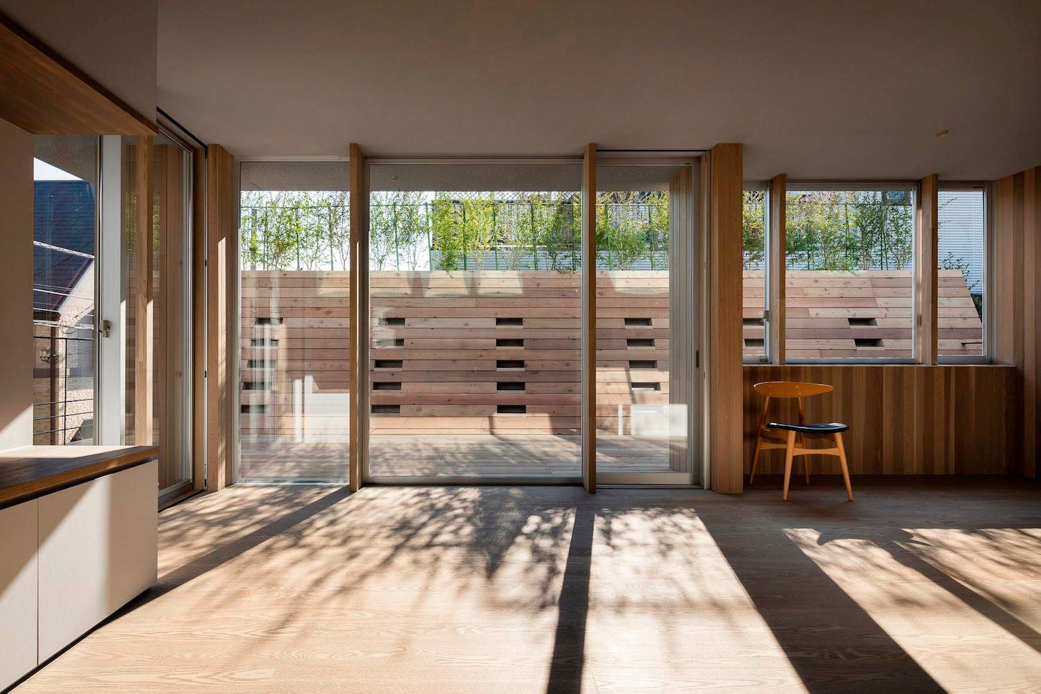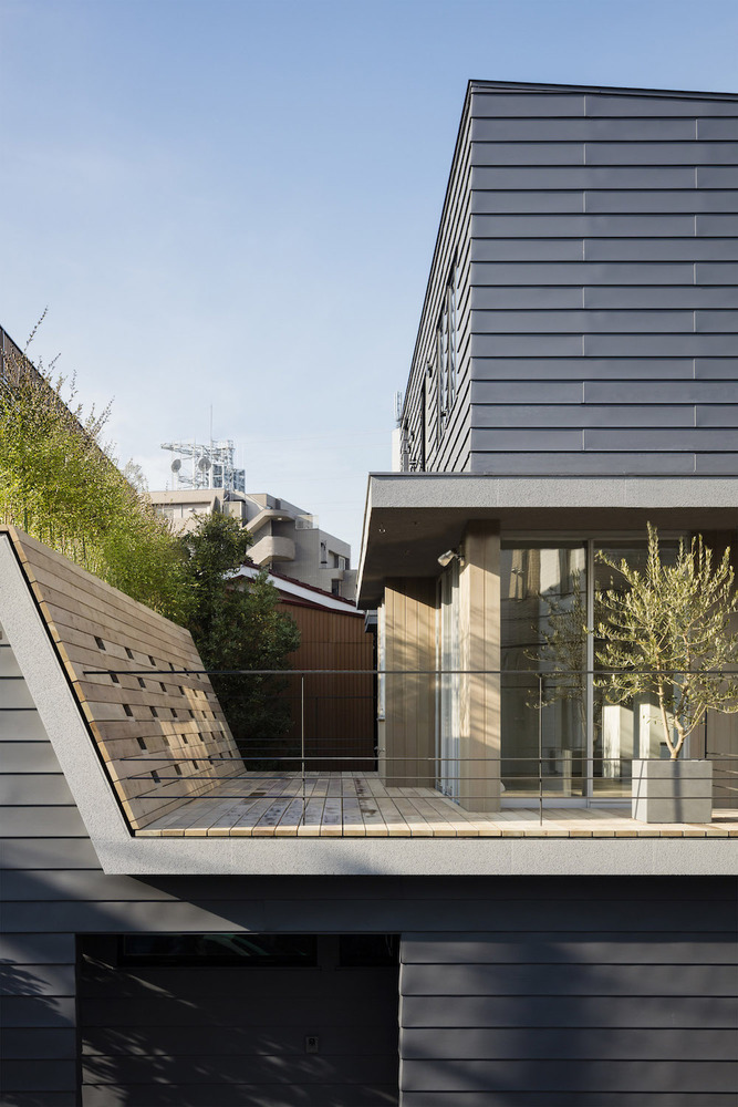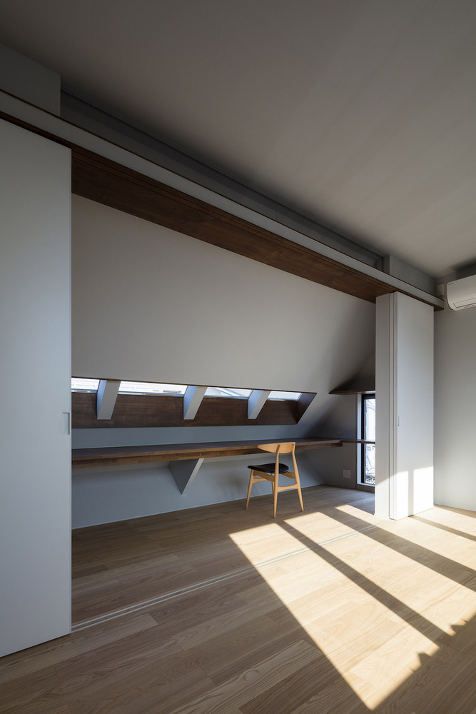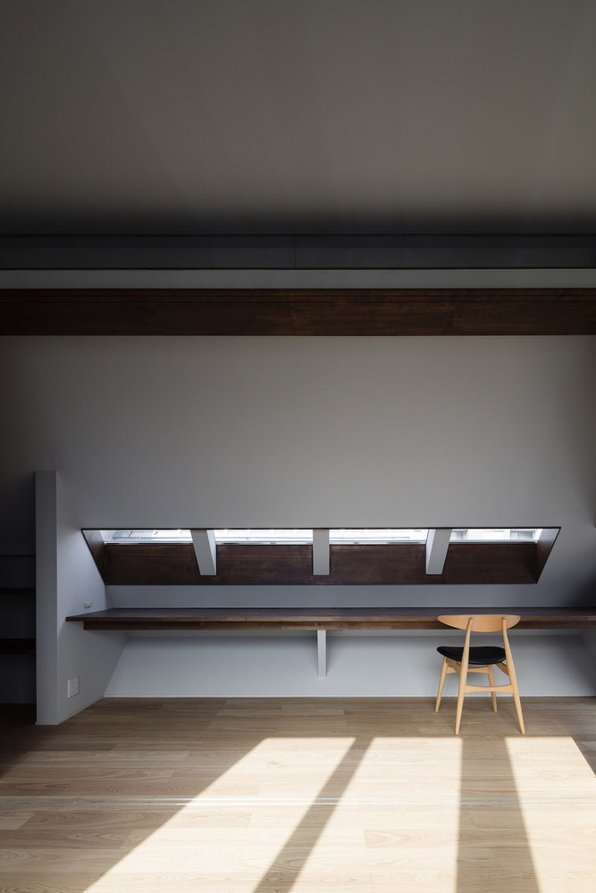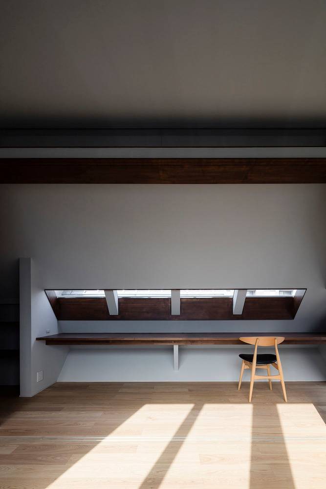 在住宅南面有一座三層公寓樓的情況下,為了將更多的自然光線引入一層空間,一樓的一側(cè)屋頂被設(shè)計(jì)成陡峭的斜坡,并沿著斜坡的邊緣開了一扇天窗。對(duì)二層空間來說,這處斜坡便成了一片斜墻,從一層的屋頂陽臺(tái)向上延伸,從而阻擋了隔壁公寓樓走廊上的視線,確保了住宅的私密性。此外,建筑師還沿著一層屋頂?shù)男逼逻吘壏N了樹,不僅進(jìn)一步遮擋了隔壁公寓三層的視線,還使陽光在室內(nèi)灑下了斑斑駁駁的亮點(diǎn),使住戶能夠更好地享受由陽光和綠植創(chuàng)造出來的不斷變化的光影。