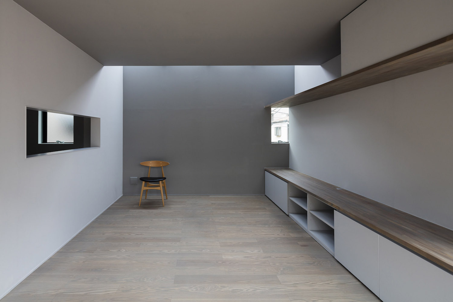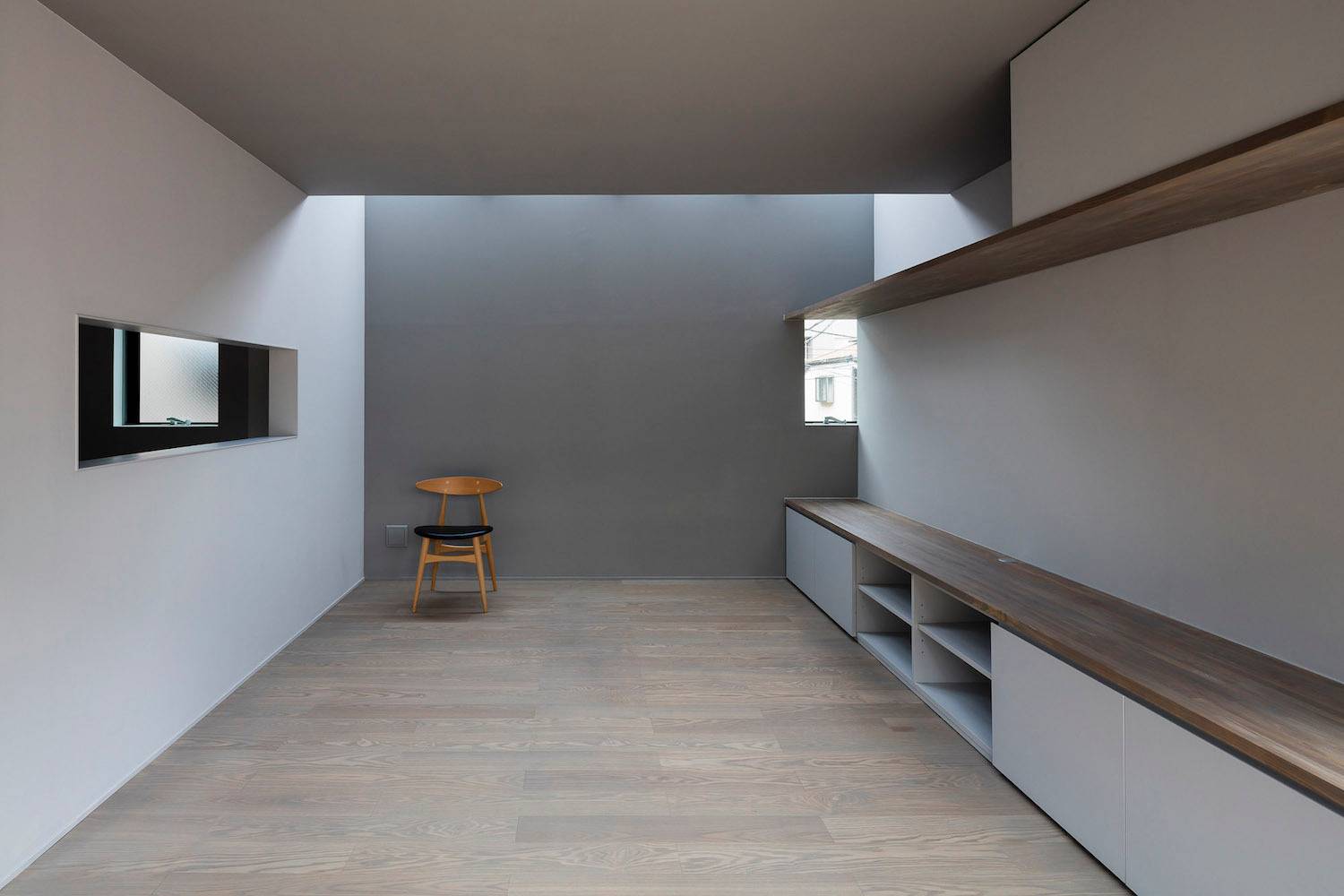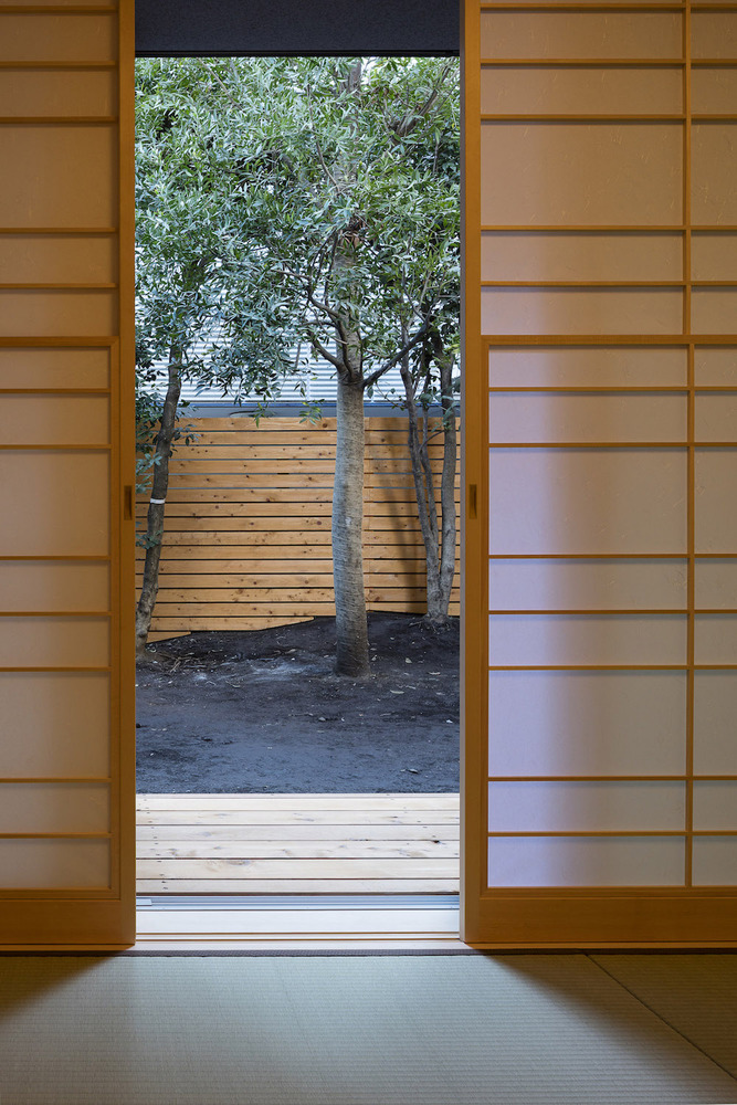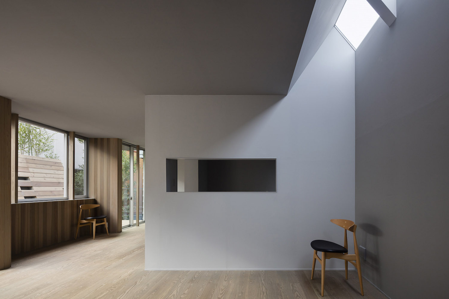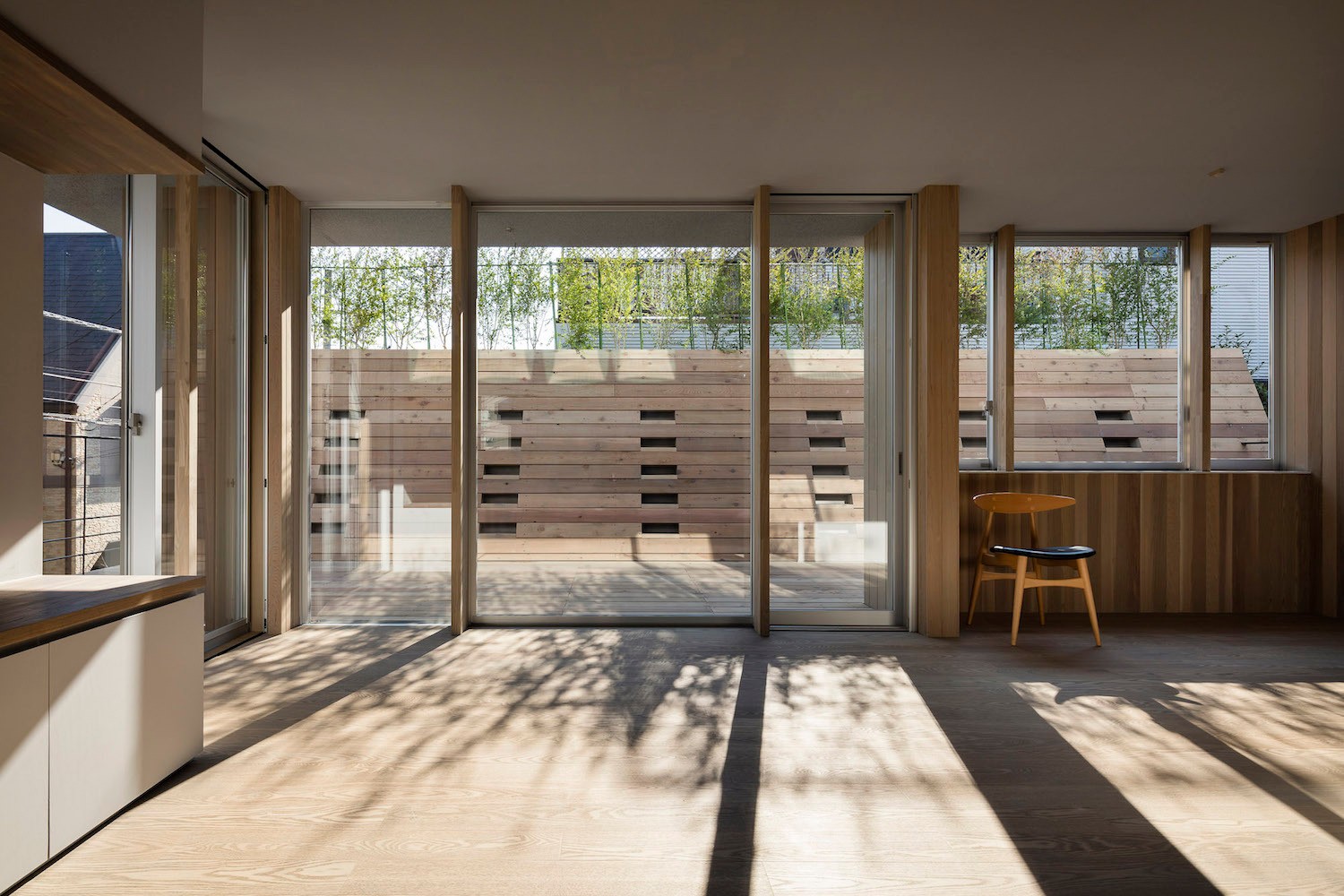 在住宅南面有一座三層公寓樓的情況下,為了將更多的自然光線引入一層空間,一樓的一側(cè)屋頂被設(shè)計(jì)成陡峭的斜坡,并沿著斜坡的邊緣開了一扇天窗。對(duì)二層空間來說,這處斜坡便成了一片斜墻,從一層的屋頂陽臺(tái)向上延伸,從而阻擋了隔壁公寓樓走廊上的視線,確保了住宅的私密性。此外,建筑師還沿著一層屋頂?shù)男逼逻吘壏N了樹,不僅進(jìn)一步遮擋了隔壁公寓三層的視線,還使陽光在室內(nèi)灑下了斑斑駁駁的亮點(diǎn),使住戶能夠更好地享受由陽光和綠植創(chuàng)造出來的不斷變化的光影。