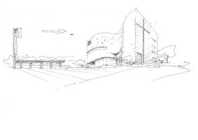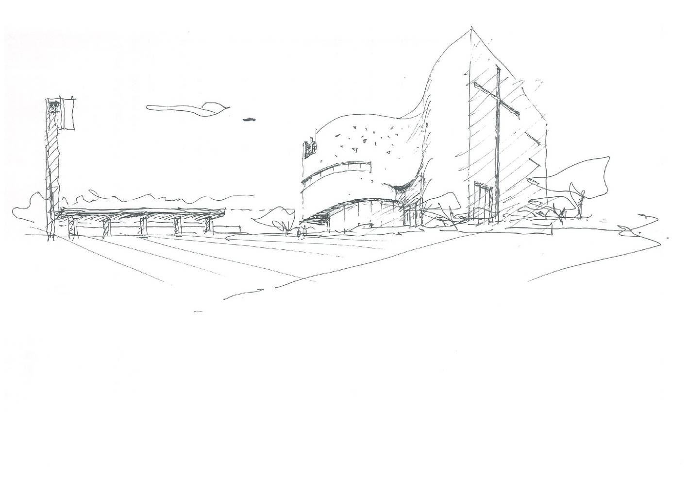 圣光教堂已將前部道路上的街區(qū)專用于地下停車場功能。在緊急情況下,停車場的屋頂可以用作戶外停車場,但是非緊急狀況下它通常被用作一個開放的多功能空間,比如歐洲教堂前面的廣場那樣。帶有十字架標志的塔樓和廊道是整座城市的標志性所在,從道路上看去,教堂的背面也具有一定的識別性。教堂對周邊建筑形成一定的限制和約束力的同時也與其相協(xié)調(diào)。教堂中間向內(nèi)凹進的曲線立面不僅起到裝飾作用,而且還是一面將整個教堂內(nèi)部和外部空間特征突顯出來的墻。這面墻是方案的一個核心概念,展現(xiàn)出歡迎人們來此的姿態(tài),仿佛它將廣場和城市圍合在內(nèi)一般。教堂希望這是一個對基督徒生活文雅高尚的暗喻。該弧線立面的設(shè)計會給人們留下圣光教堂的第一印象,其表面燈光色彩多變,好似一個發(fā)光體,這也與教堂的名稱有所呼應(yīng)。