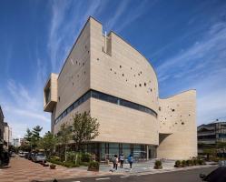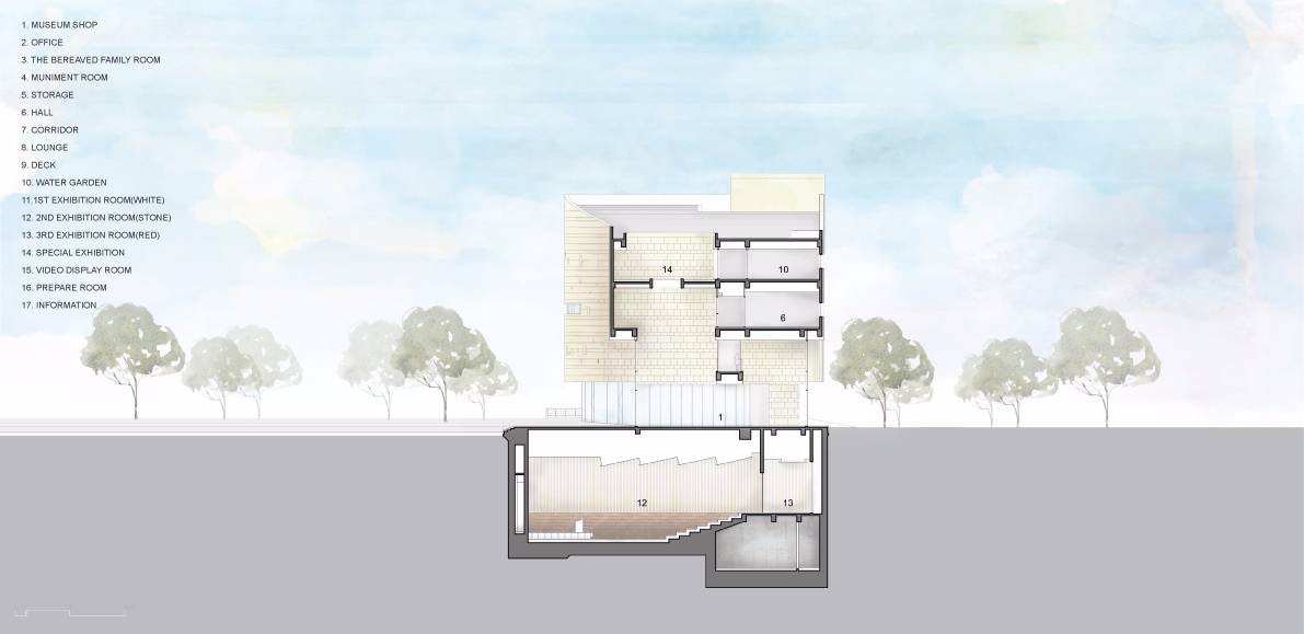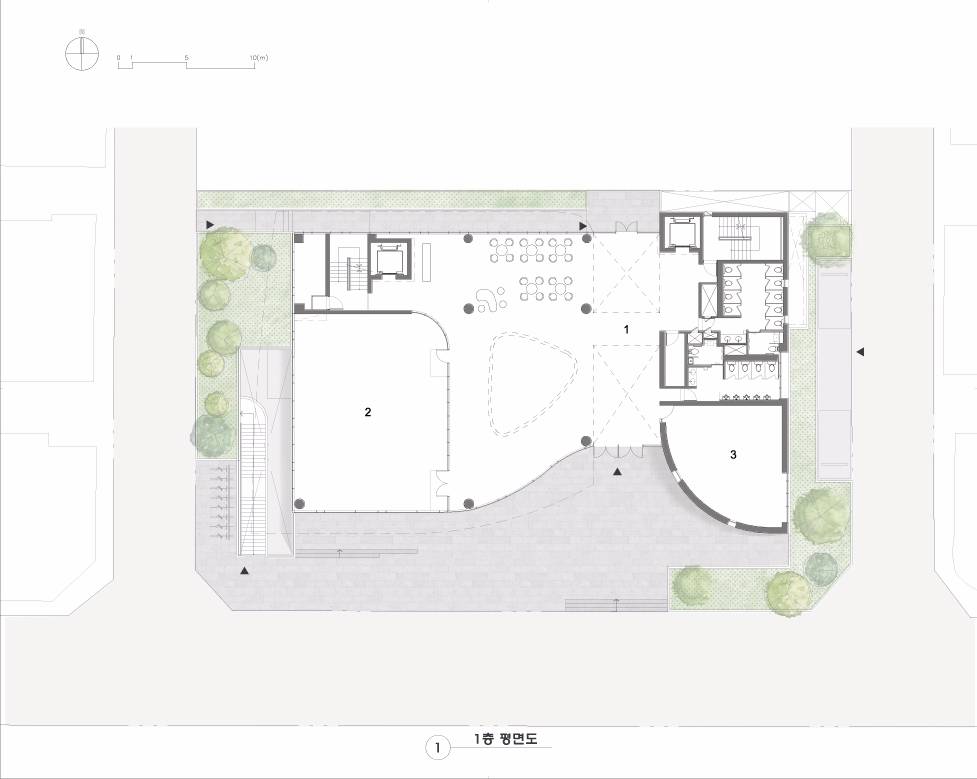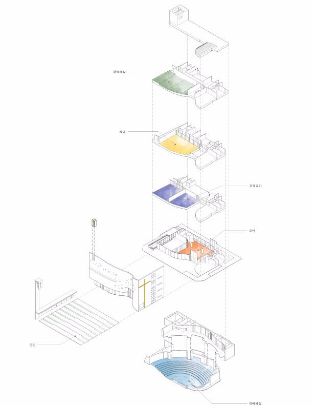 朝向城市開放的圣光教堂在平面中設(shè)置有一條連續(xù)的走道,就有從主大街開始,穿過教堂廣場,穿過大廳,再通往教堂后面與其緊鄰的公園的空進序列。門廳是一處露天的室內(nèi)廣場和供兒童使用的開放大廳。整個大廳從水平方向上向四周開放,促進城市重新煥發(fā)活力,同時該教堂為社區(qū)提供了明亮而開放的空間。由于現(xiàn)代教堂是一處綜合性的公共設(shè)施,許多信徒都會在這里做禮拜、結(jié)交或者舉行各種聚會等。因此要在狹窄的地面上堆放不同的功能空間就很有必要提供有效的空間以及流暢的交通系統(tǒng),同時還要開發(fā)利用地下空間,將其用作祈禱室。因此,位于大田市鄧桑中心區(qū)的圣光教堂由以下三個部分組成。