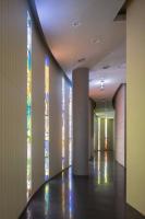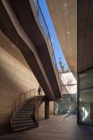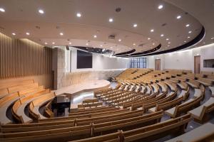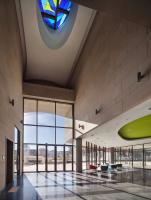 地下祈禱空間在給定的有限場地內(nèi)將座位數(shù)設(shè)置到了最大值。此外,該空間內(nèi)并沒有設(shè)置單獨的樓廳座位,目的在于創(chuàng)建一處有助于社區(qū)團結(jié)的空間。地下祈禱空間非常寬敞并且可達性很強,直接通過室外的下沉花園就可以到達而無需穿過室內(nèi)大廳。祈禱空間與城市的喧囂相隔絕,因此非常安靜。此外,漏斗形的地下大廳成為了一處愉悅而明亮的空間,頂部有光線從彩色玻璃窗濾下。此外,主教堂的半圓形觀眾席平面和比觀眾席稍低的講壇有效減弱了宗教的嚴肅感。這樣的布局可以促進傳教員和信徒之間的和諧關(guān)系。