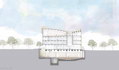 一樓的大廳被設(shè)計成一個公共空間,市民可以隨意進入,因為它的正面面向室外廣場和毗鄰教堂后側(cè)的公園。教堂內(nèi)設(shè)置有教育用房,有專門的管理人員嬰兒和幼兒提供服務(wù),這些房間在其他時候也可以用作咖啡廳。大部分教育空間主要位于上層空間內(nèi)。因為上層可以為孩子們提供更加明亮和優(yōu)美的景觀視野。這種功能布局朝各個方向開放,為后代創(chuàng)造了一個有效的教育環(huán)境。建筑本身易于進出,孩子們可以充分享受到多功能大廳和屋頂花園的樂趣。