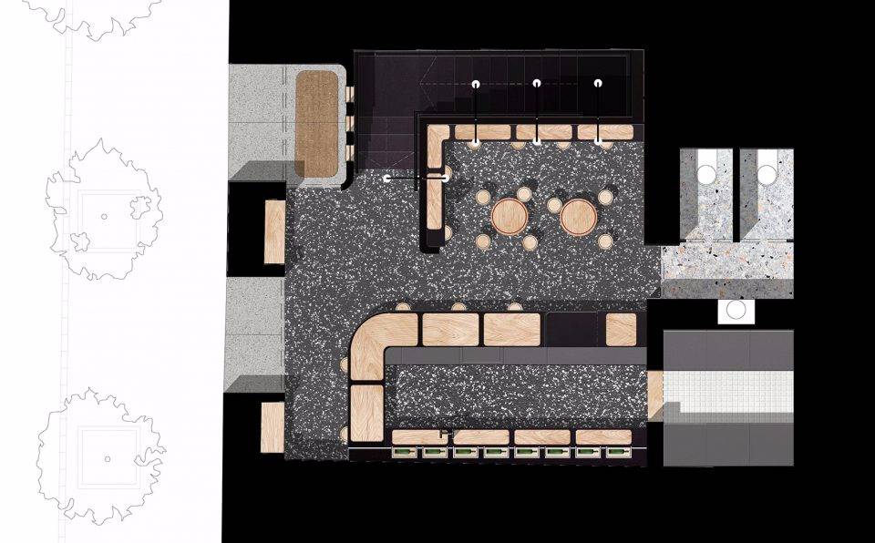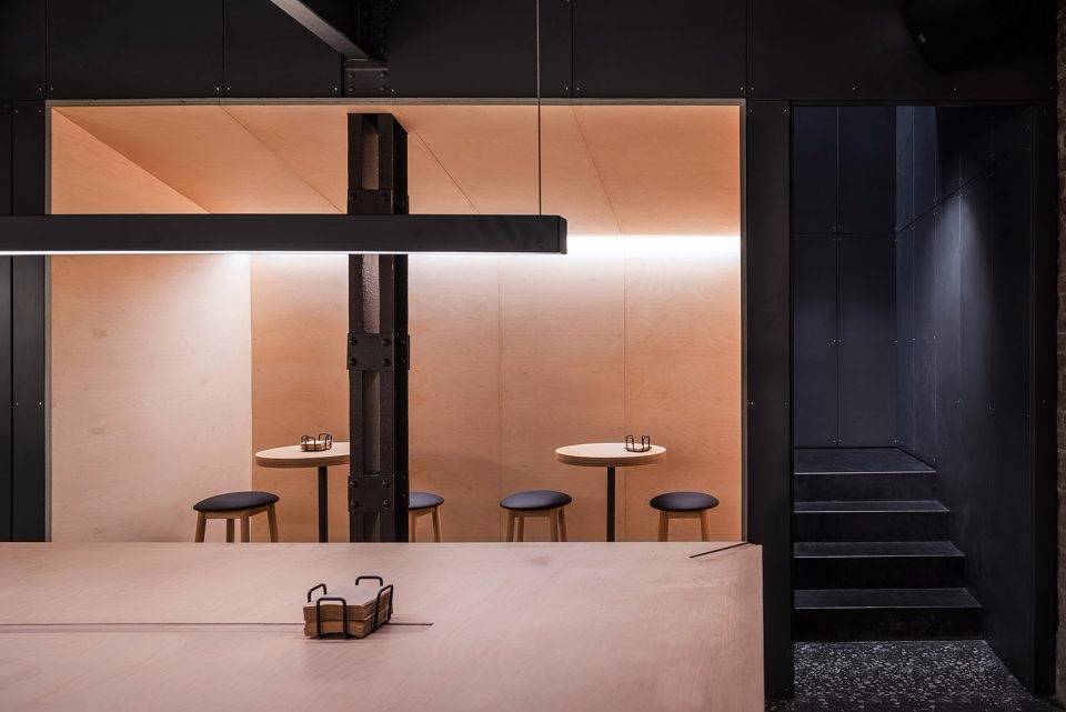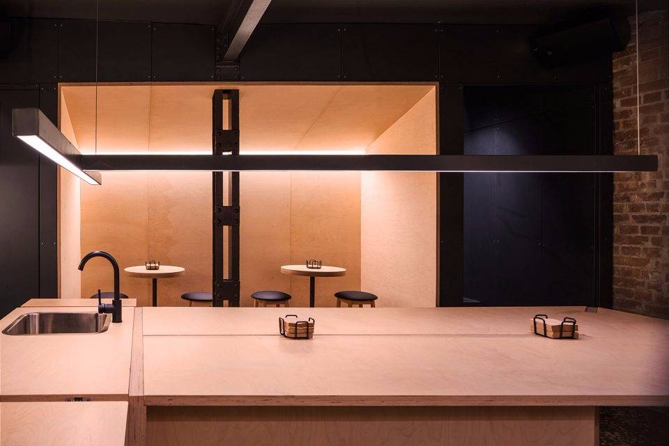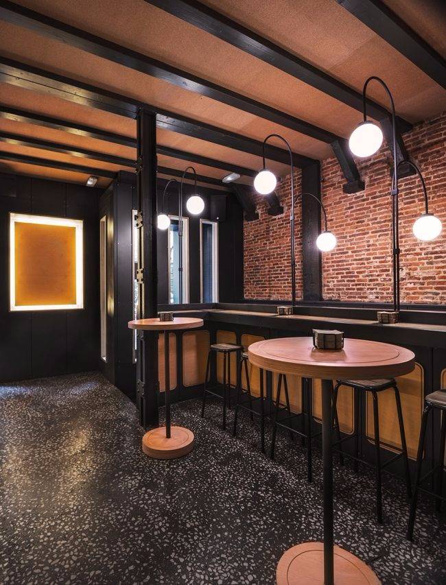 小食堂是西班牙美食生活中最傳統(tǒng)的組織形式,色環(huán)境似乎對這一形式進行重新解讀,通過不同桌椅的重新分配,獲得更為抽象化的傳統(tǒng)用餐空間形態(tài)。由樺木板打造的細木護壁板鑲嵌在家具四周作為裝點。原建筑的磚墻立面及地板被全部保留,它們圍合出餐廳的主要功能區(qū),描繪出具有顛覆性的空間氛圍。