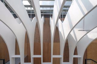 白色的板片,在空間中蜿蜒躍動形成空間的皮層,是天花,是墻面,也是柜體。它穿梭在暖色的夾板墻體之間界定出不同的使用空間,高低與層次。不同的空間在漫射柔和的光線中融合為一。