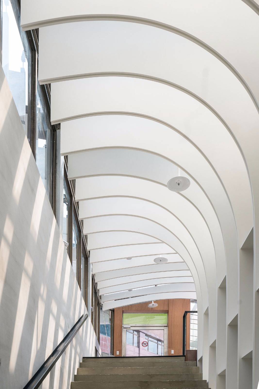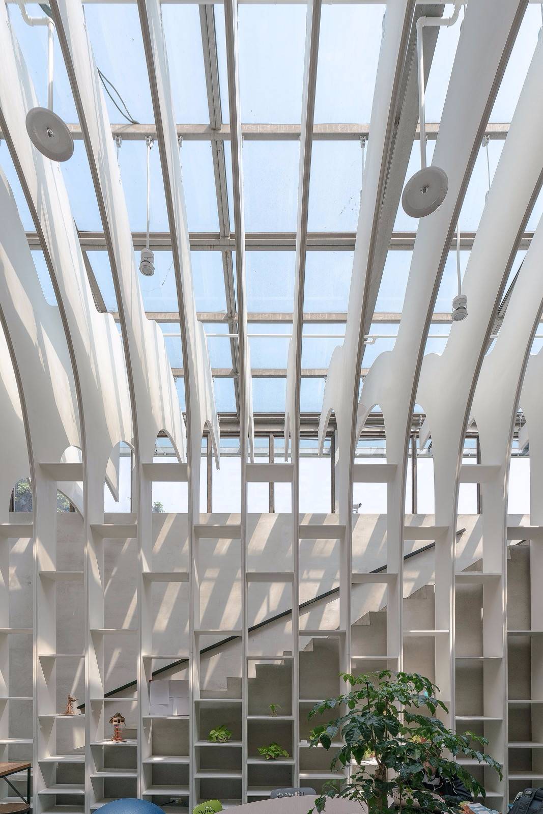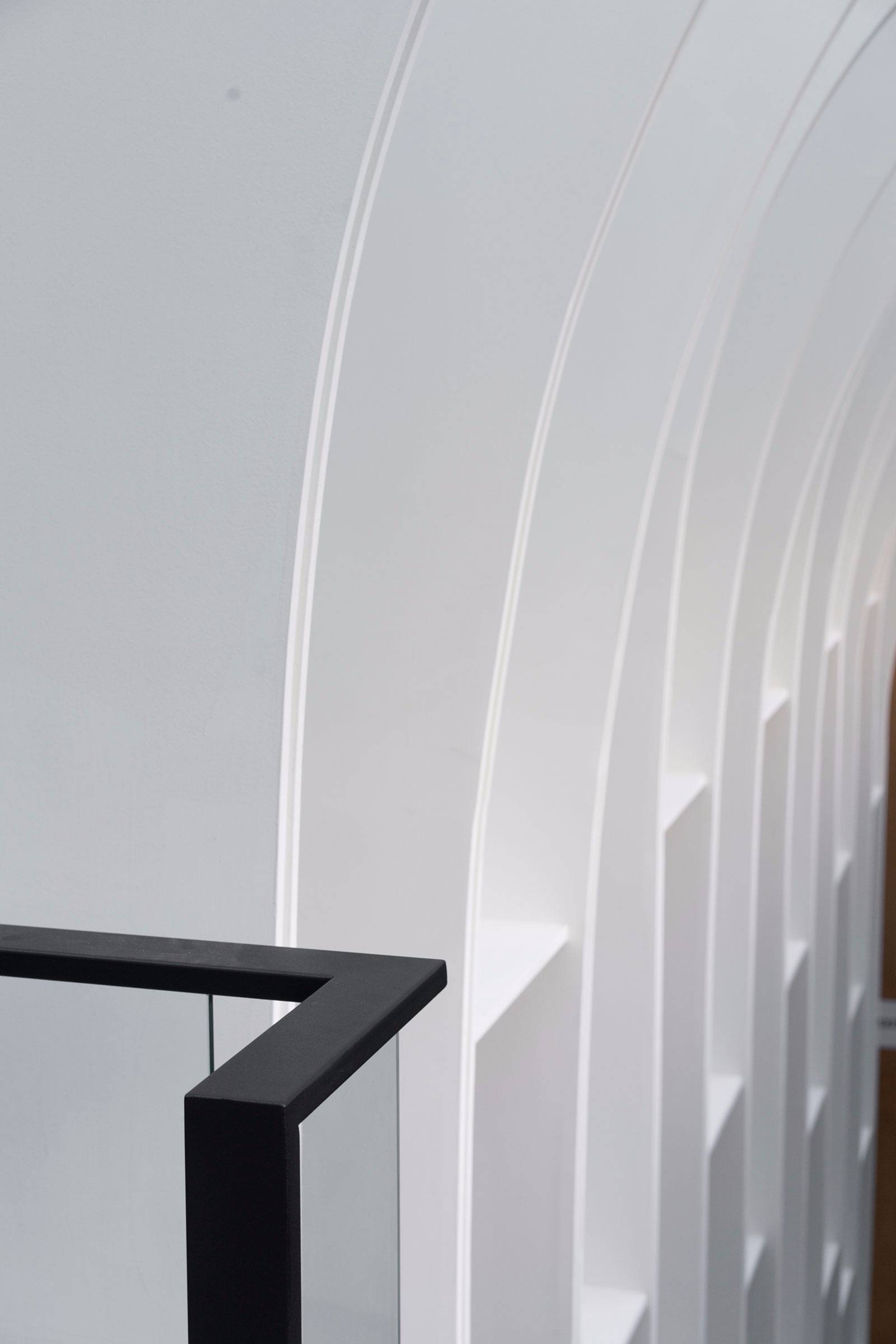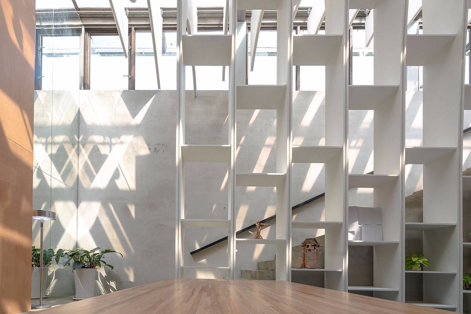 空間中唯一的陽光來自上方的天窗,透過白色律動的板墻從天花延伸形成墻面,過濾著由戶外進(jìn)入室內(nèi)的陽光,同時(shí)界定出空間的層次。白色格板能隔絕陽光形成律動的陰影,能反射陽光創(chuàng)造出躍動的光影,或是漫延陽光營造出柔和的光域。