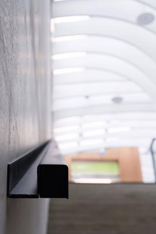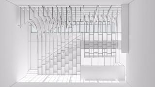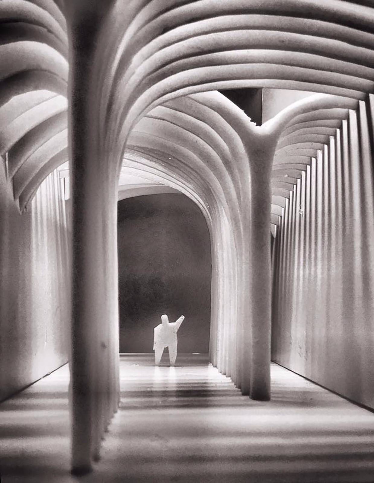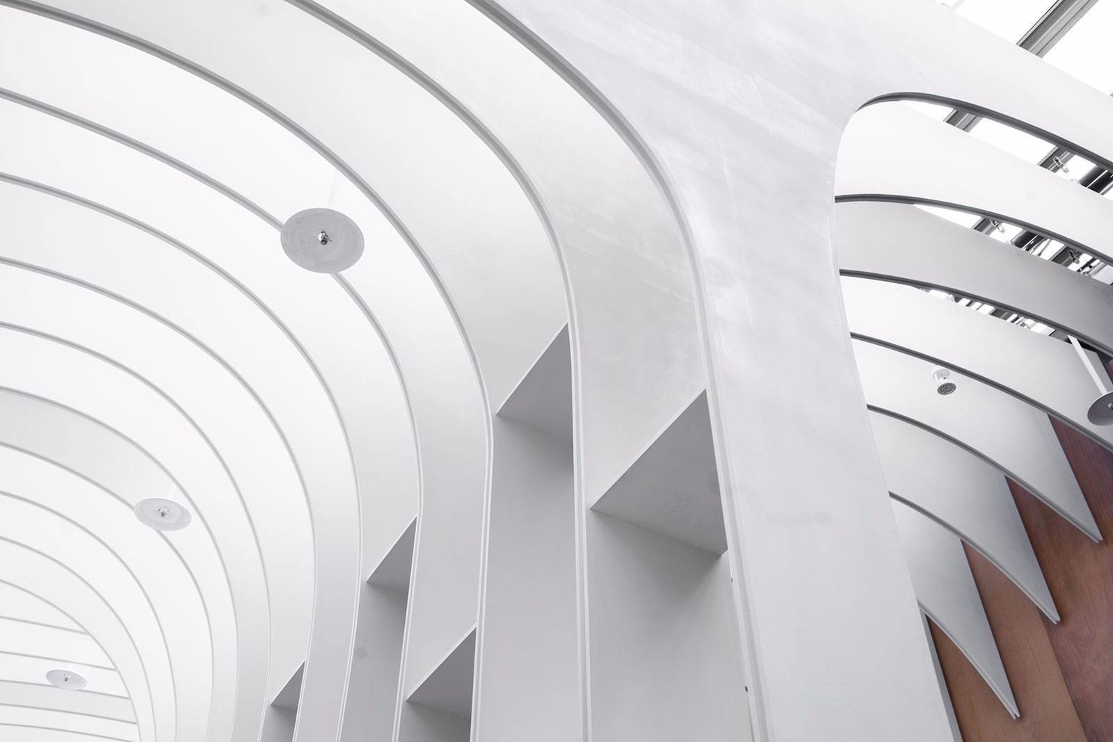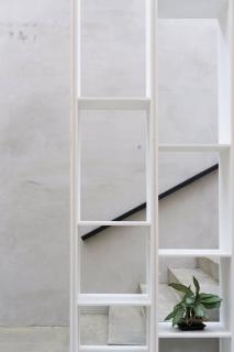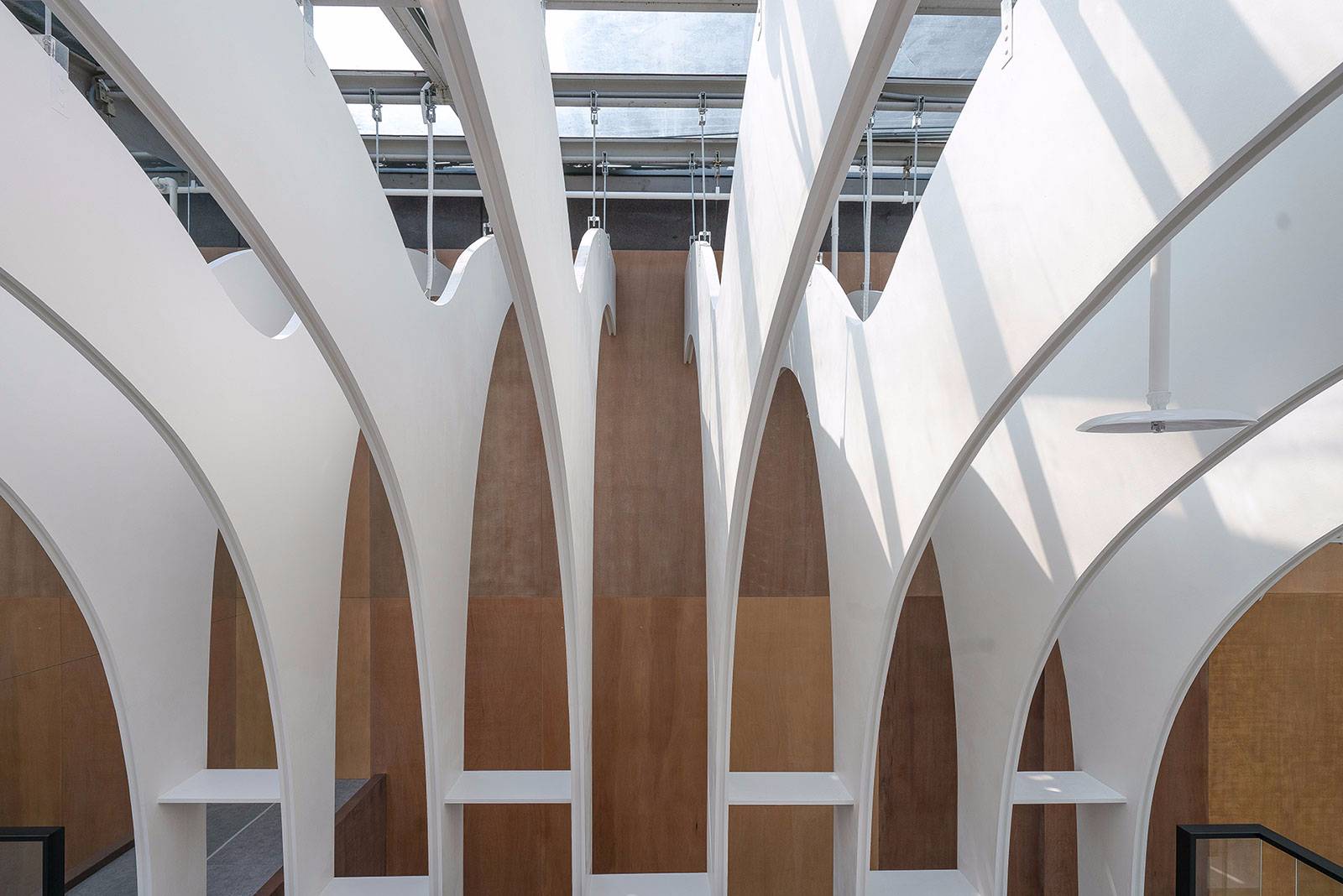 空間中唯一的陽光來自上方的天窗,透過白色律動的板墻從天花延伸形成墻面,過濾著由戶外進(jìn)入室內(nèi)的陽光,同時(shí)界定出空間的層次。白色格板能隔絕陽光形成律動的陰影,能反射陽光創(chuàng)造出躍動的光影,或是漫延陽光營造出柔和的光域。