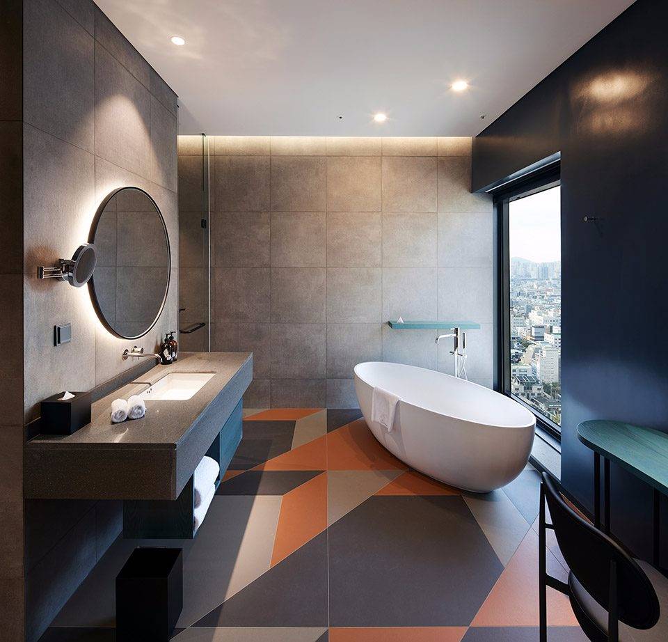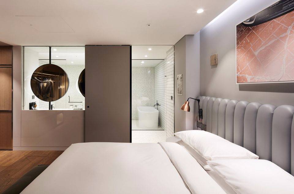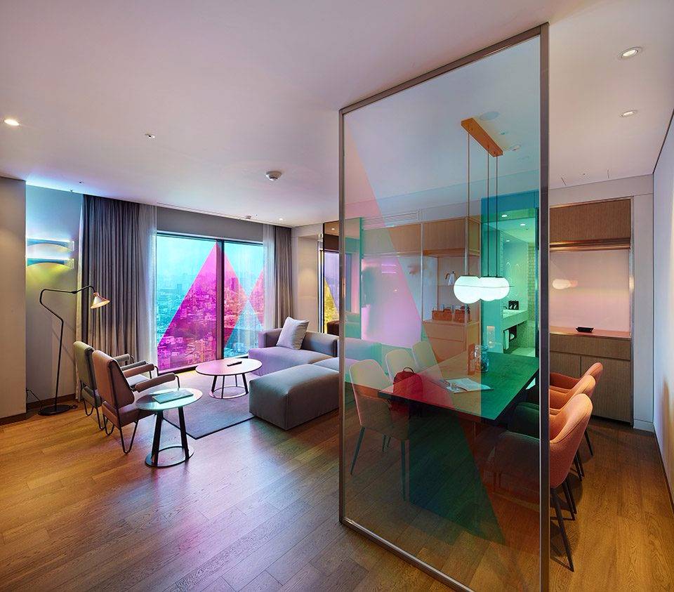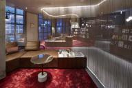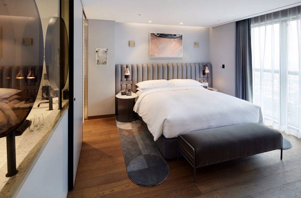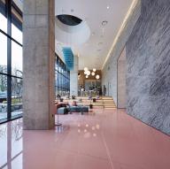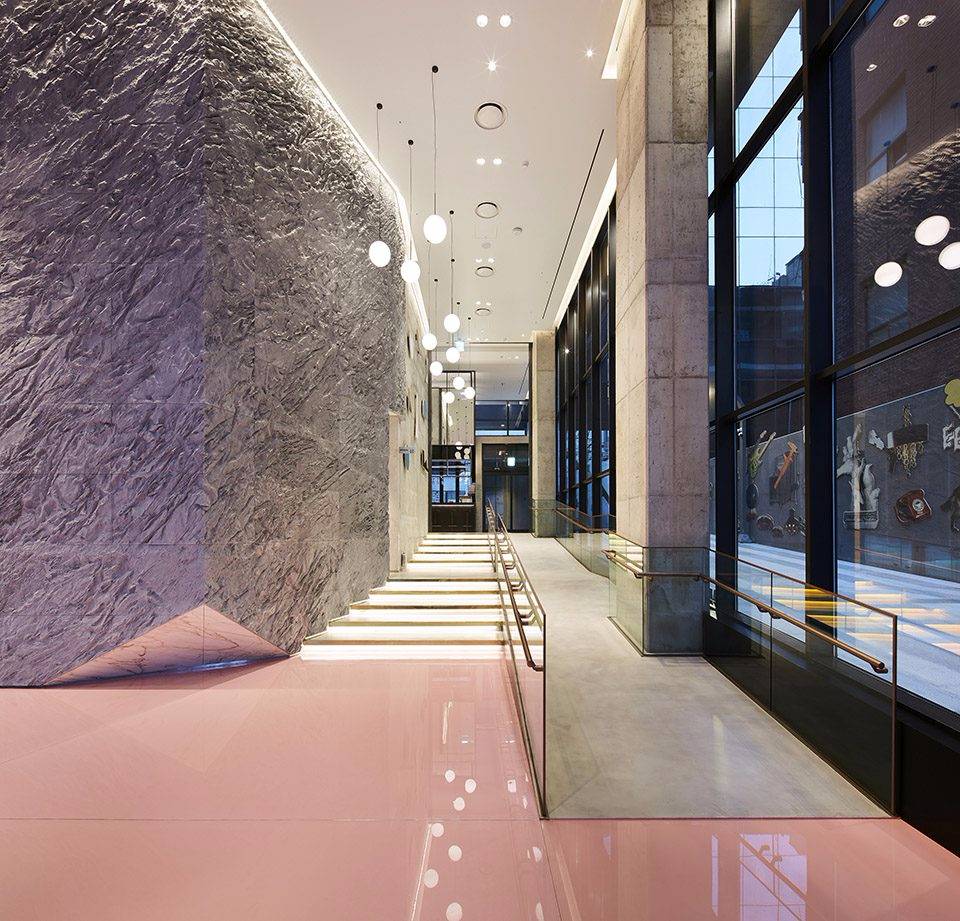 Michaelis Boyd希望為酒店打造一個特別的第一印象。設(shè)計師以韓國獨特的自然風(fēng)景為設(shè)計靈感,三層高的入口大廳給人留下了深刻印象??逃歇毺丶y理的混凝土板于地面輕輕抬起,與拋光的大理石地板形成強烈的對比關(guān)系。
