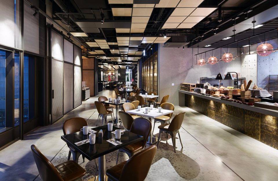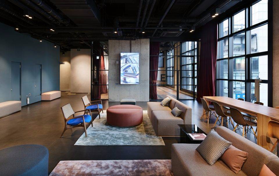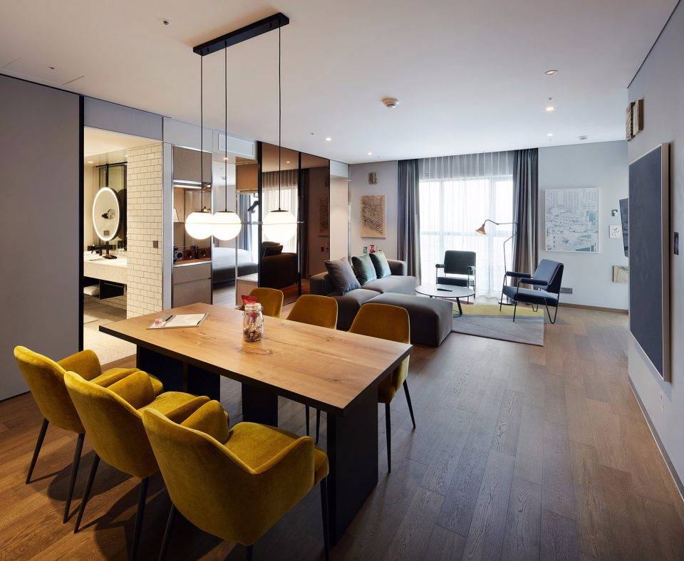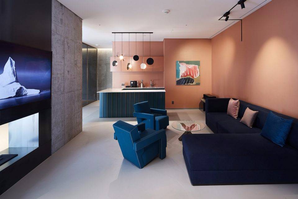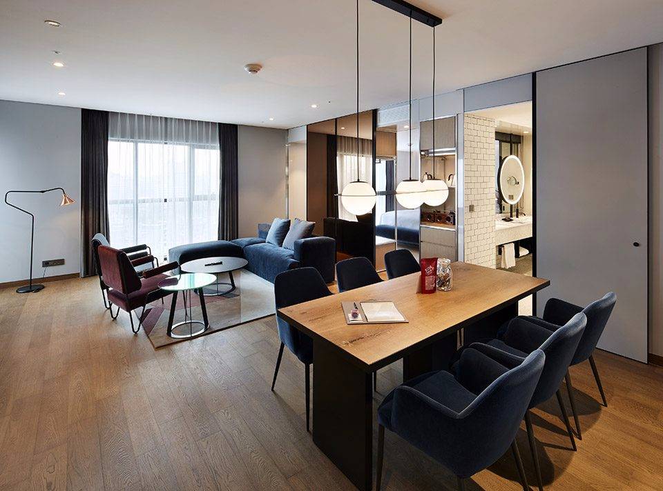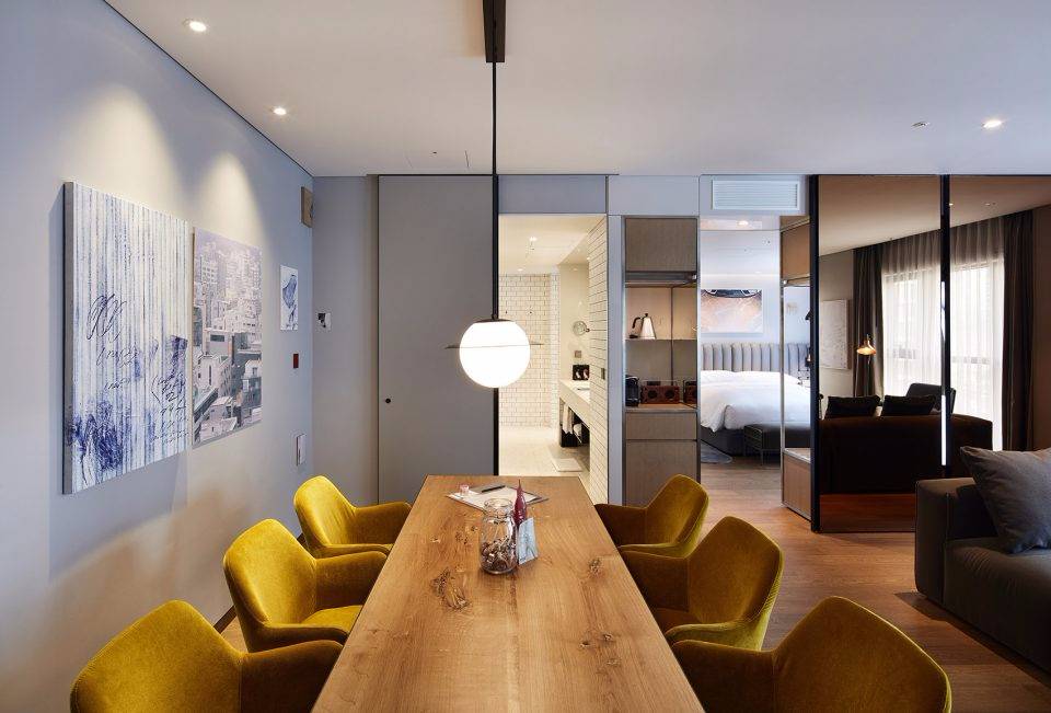 Michaelis Boyd希望為酒店打造一個特別的第一印象。設(shè)計師以韓國獨特的自然風(fēng)景為設(shè)計靈感,三層高的入口大廳給人留下了深刻印象??逃歇毺丶y理的混凝土板于地面輕輕抬起,與拋光的大理石地板形成強烈的對比關(guān)系。