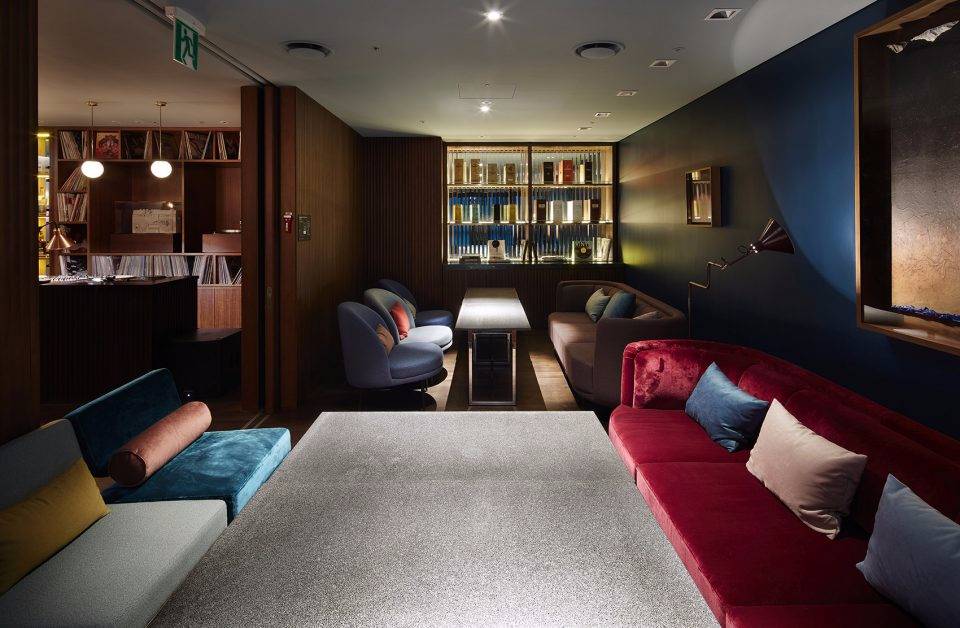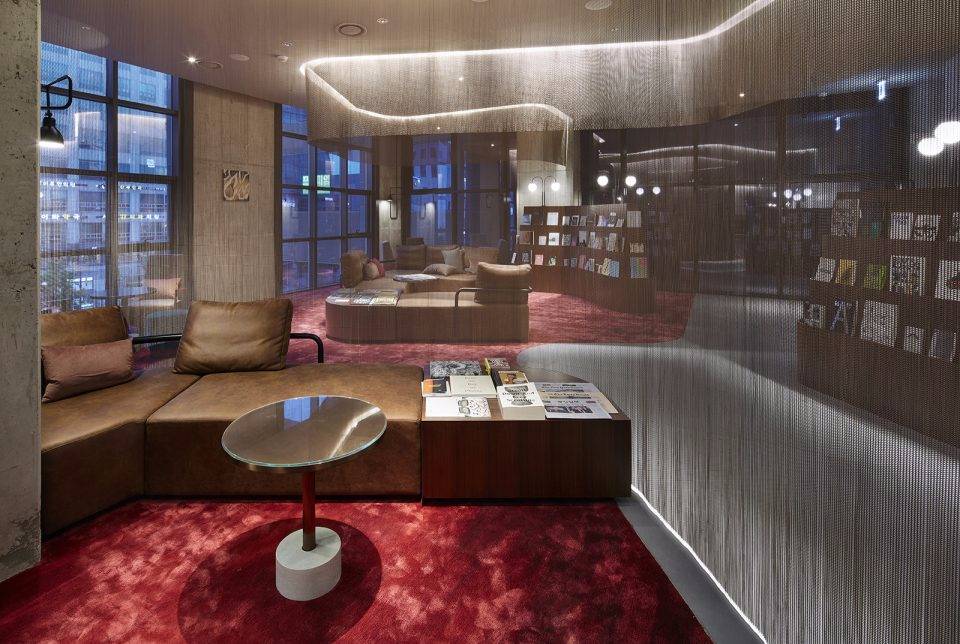 接待處和休息大廳以紅色和金色相稱的走廊大廳展現(xiàn),隨處擺放的藝術(shù)作品無不彰顯了Hongdae的特有歷史。由天花板垂下的黃銅網(wǎng)幕簾,在空間中環(huán)繞交織,圍合出半透明的私密空間。