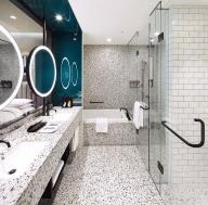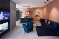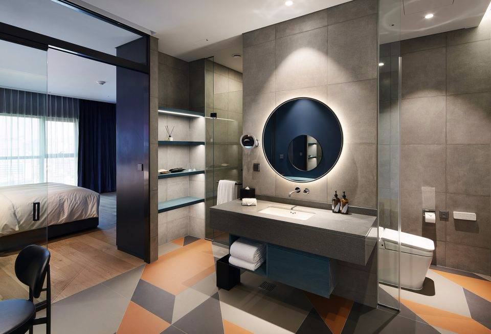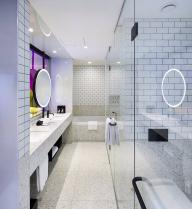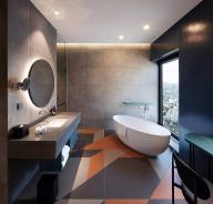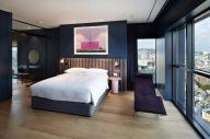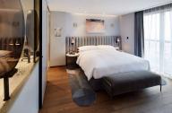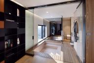 啞光金屬框架和木材貼面的儲物單元打造出精致且功能強大的客房空間。定制的空間裝置系統(tǒng)圍合迷你吧臺,置物架系統(tǒng)及收納空間。床頭板由皮革毛氈定制而成。透明隔墻將臥室與浴室分割的同時,又保留了視覺上的連通性。而滑動鏡面門和百葉則充分保障了使用者的私隱。明亮和開放的浴室空間與色彩豐富的臥房和起居空間產(chǎn)生強烈對比。浴室墻壁由亮面瓷磚鋪設(shè),水磨石臺面圍合出精致的洗手池。