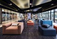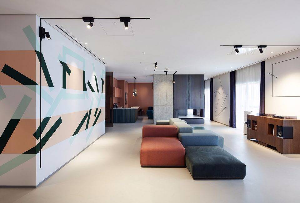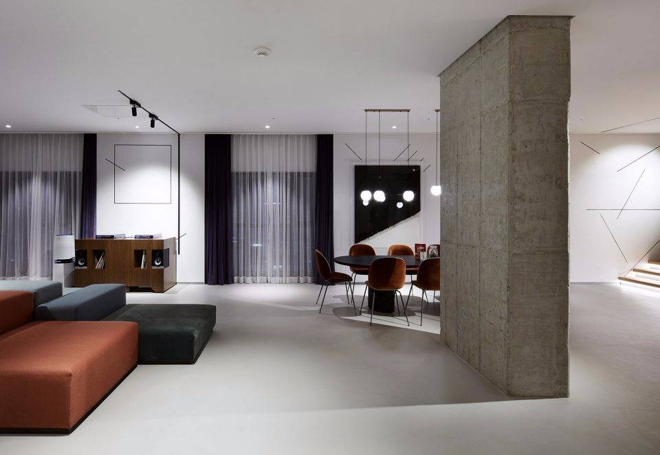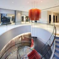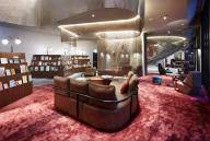 位于該區(qū)域中心一部雕塑般的橢圓形樓梯,帶領(lǐng)來訪者穿梭在一層到四層之間。艷紅色的地毯與拋光混凝土地板和混凝土天花板形成鮮明對比,精致奢華的棕褐色定制皮革家具豐富了這個空間。
