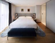 酒店客房采用自然色彩中的綠色和藍色為主色調(diào),結(jié)合深褐色皮革,深色木材紋理和灰色調(diào)細節(jié)奠定了空間基調(diào)??头吭O(shè)計的主要理念是打破以入口走廊和浴室作為區(qū)域分割的空間布局方式。Michaelis Boyd用具有空間滲透性的隔墻將各功能區(qū)分割開來。開放性的衣櫥和玻璃圍合的浴室,讓客房的視覺效果更加開闊,帶來空間的流動性。
