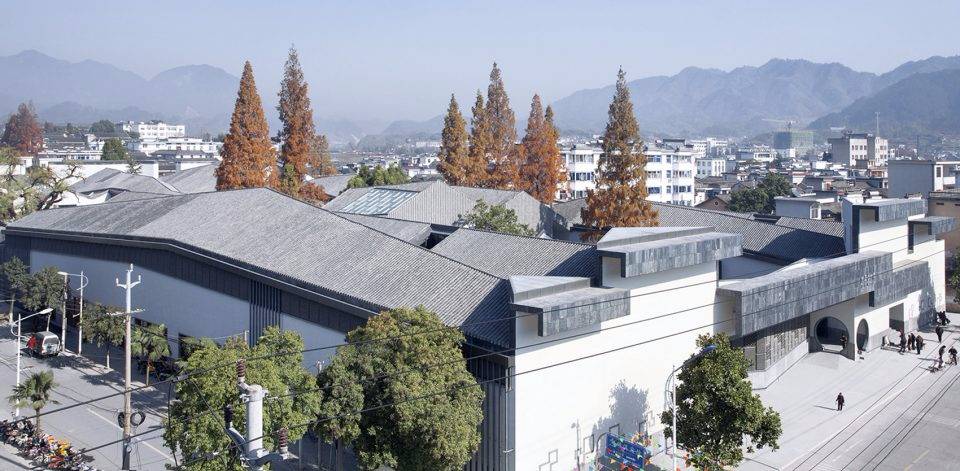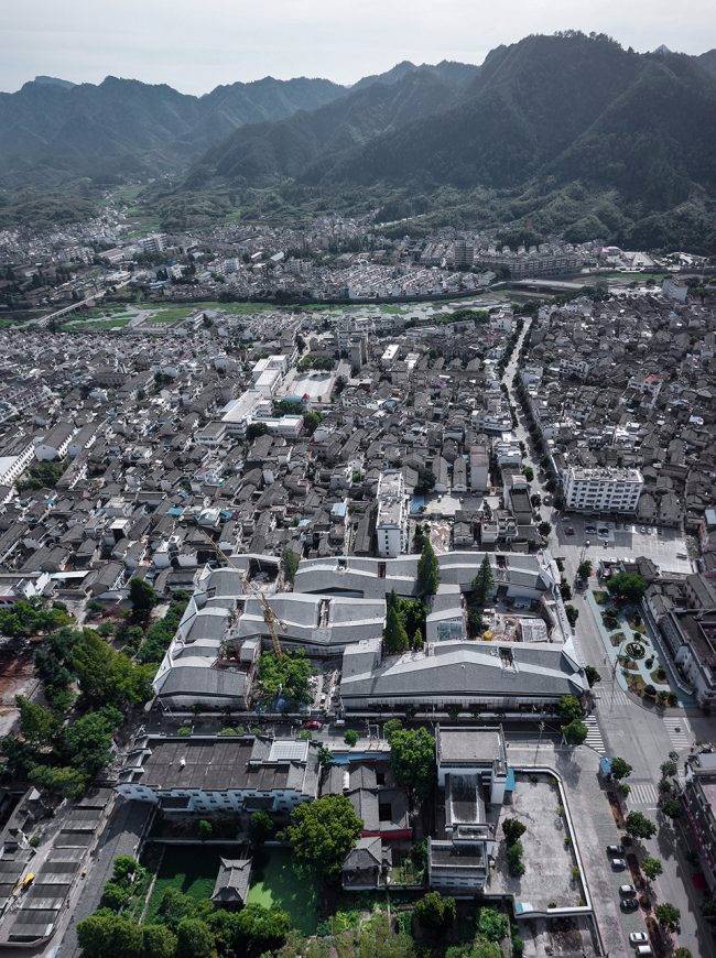 建筑設(shè)計基于對績溪的地形環(huán)境、名稱由來的考察和對徽派建筑與聚落的調(diào)查研究。整個建筑覆蓋在一個連續(xù)的屋面之下,起伏的屋面輪廓和肌理仿佛績溪周邊山形水系,是“北有乳溪,與徽溪相去一里,并流離而復(fù)合,有如績焉”的“績溪之形”的充分演繹和展現(xiàn)。待周邊區(qū)域修整“改徽”完成,古城風(fēng)貌得以恢復(fù)后,建筑將與整個城市形態(tài)更加自然地融為一體。